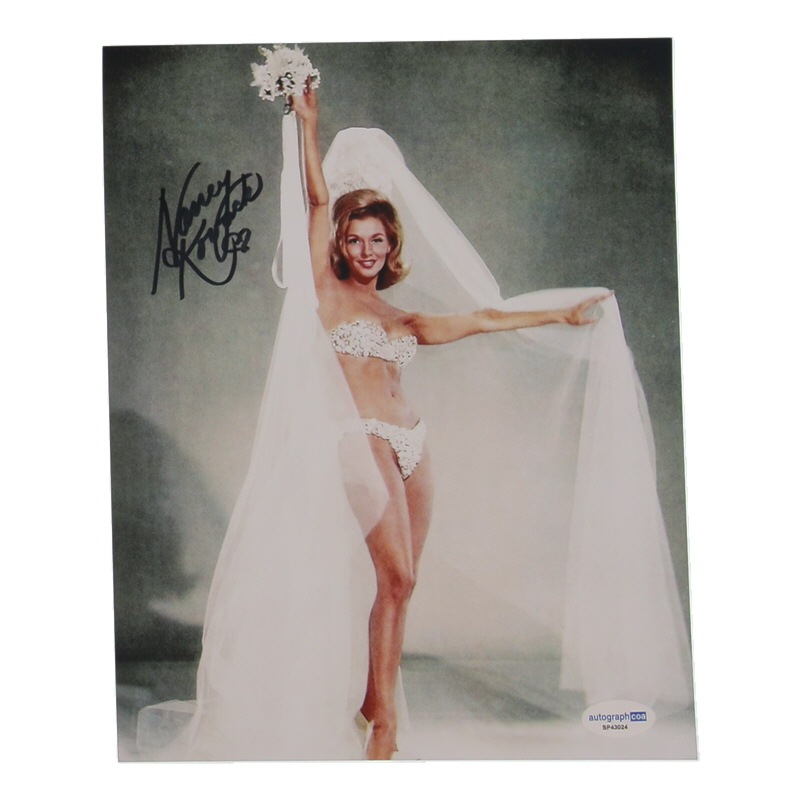 Photo measures 8" x 10" in size and has been hand-signed by Nancy Kovack.