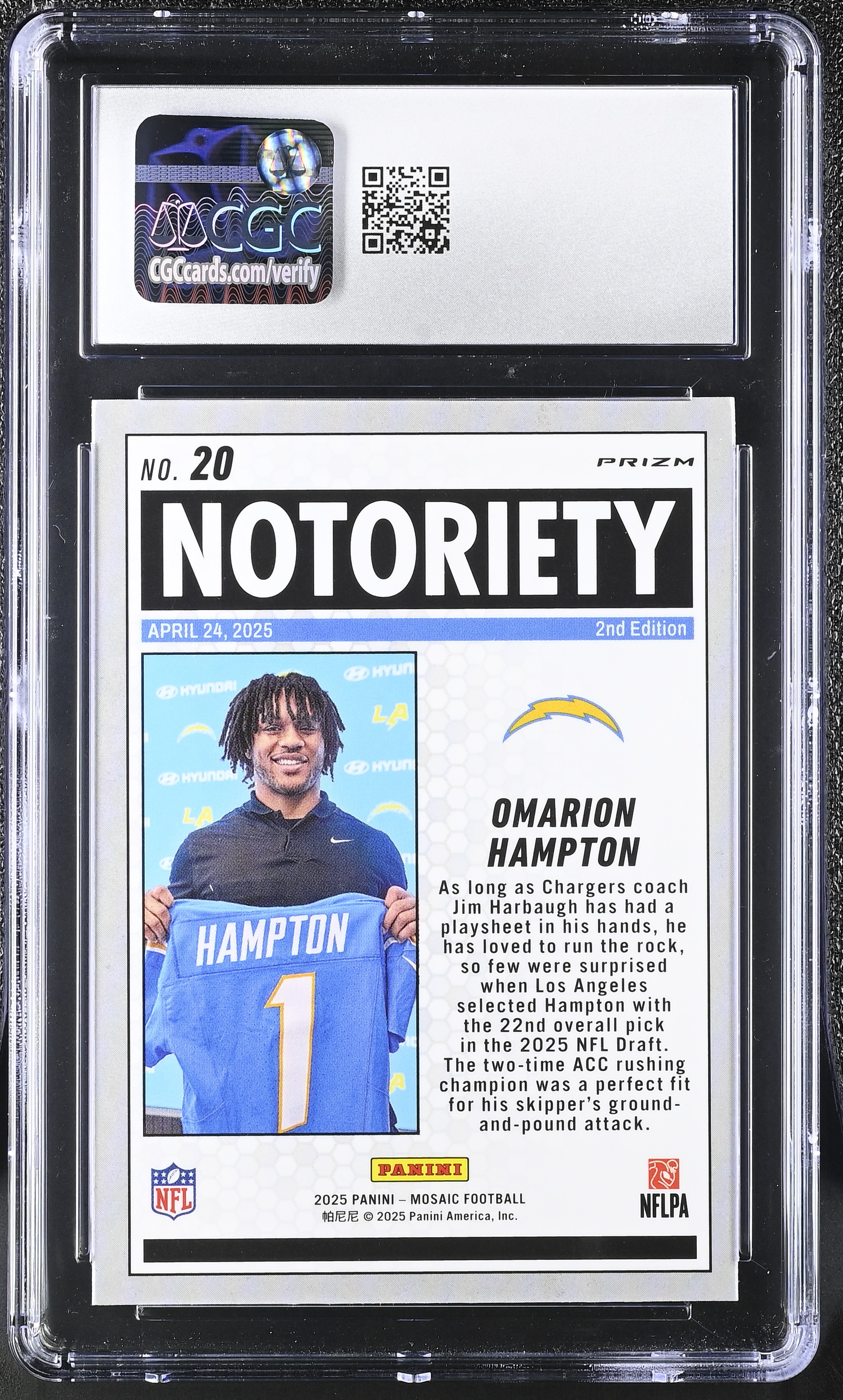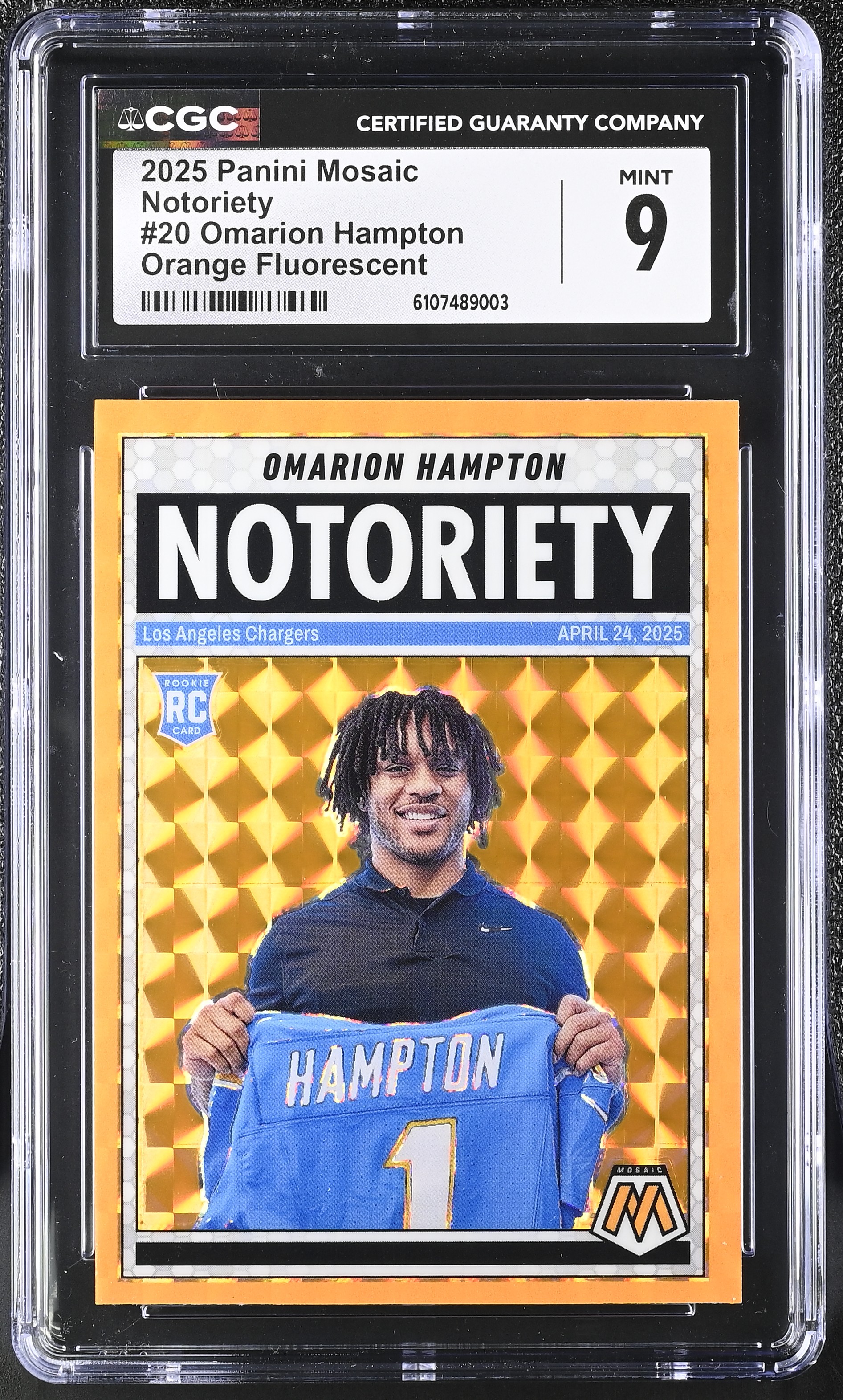 Omarion Hampton 2025 Panini Mosaic Notoriety Mosaic Orange Fluorescent #20 RC (CGC 9)