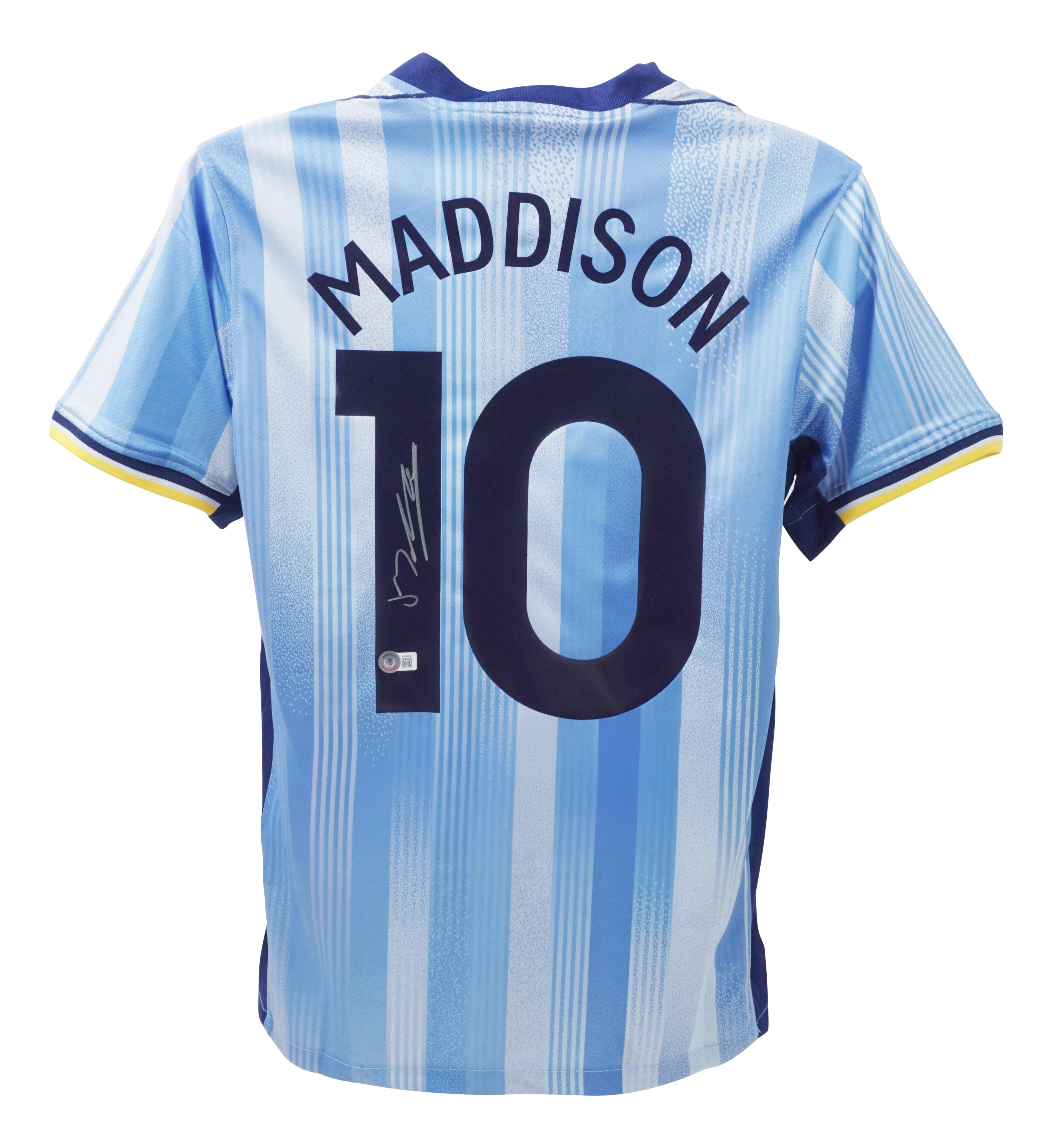 Nike jersey with everything pressed on, size L. Hand-signed by James Maddison.