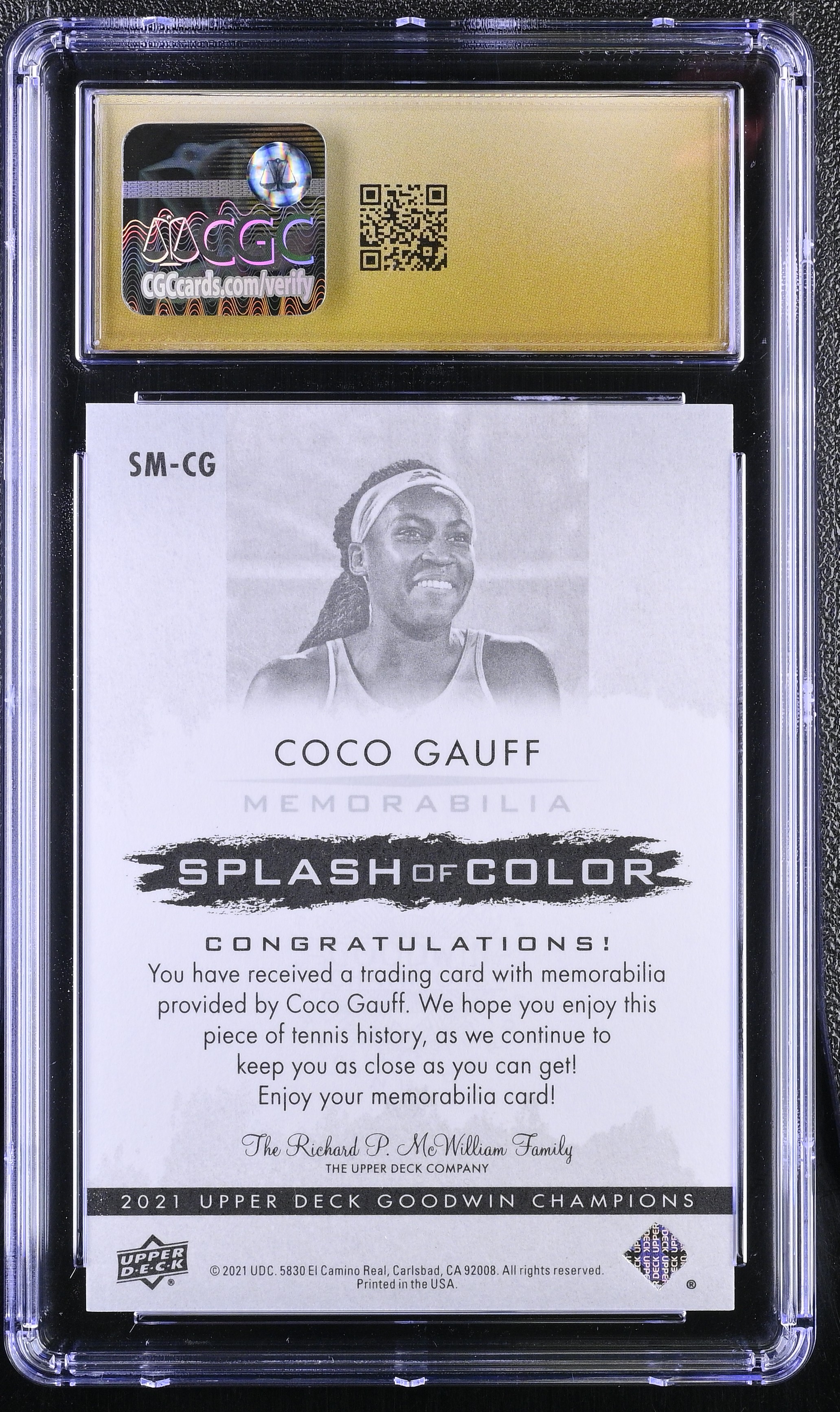 Coco Gauff 2021 Upper Deck Goodwin Champions Splash of Color Memorabilia #SMCG (CGC 10 | Pristine Black Label)