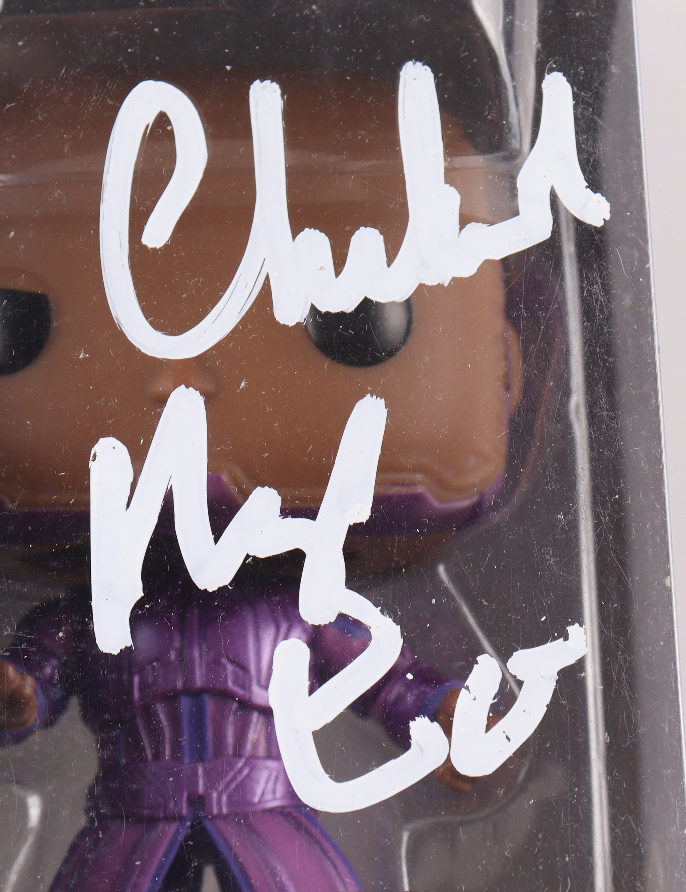 Vinyl figure measures approximately 4" tall and has been hand-signed on the packaging by Chukwudi Iwuji. Please note the window has been swapped and there is damage to the packaging.