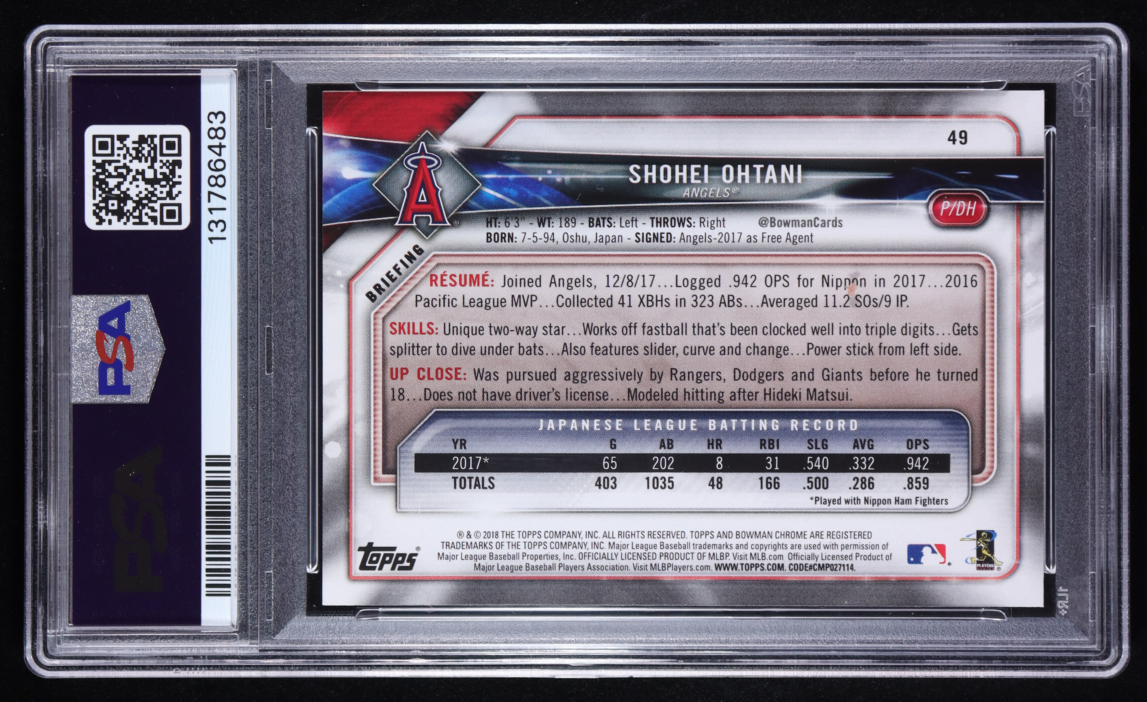 Shohei Ohtani 2018 Bowman #49 RC (PSA 10)