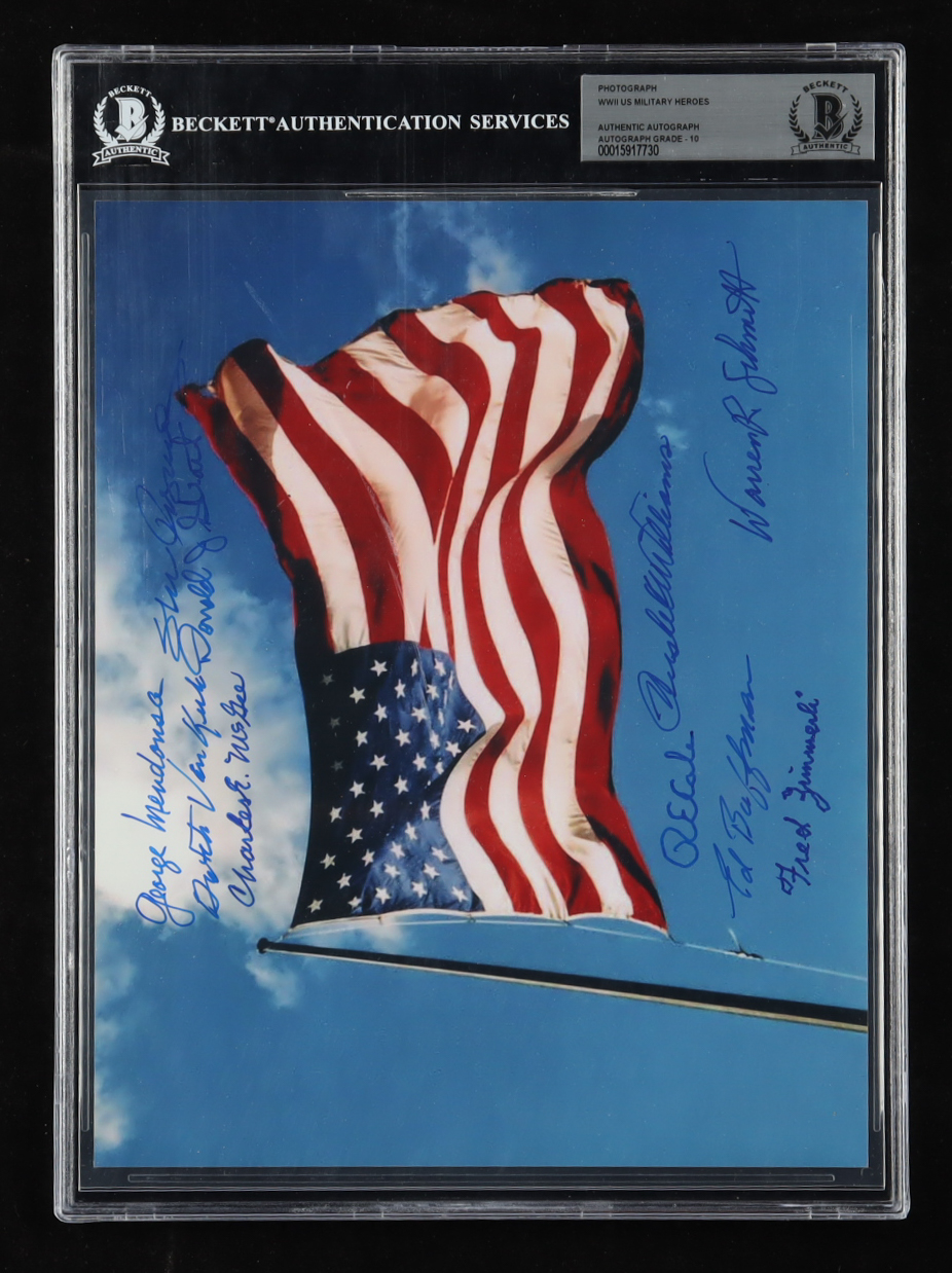 WWII U.S. Military Heroes 8x10 Photo Signed by (10) with George Mendonsa, Dutch Van Kirk, RE Cole, Fred Zimmerli (Beckett | Auto Grade 10)