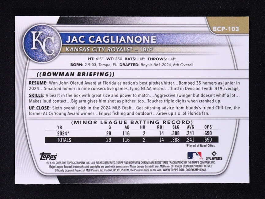 Jac Caglianone 2025 Bowman Chrome Mega Box Prospects Purple Refractors #BCP103 RC #052/250