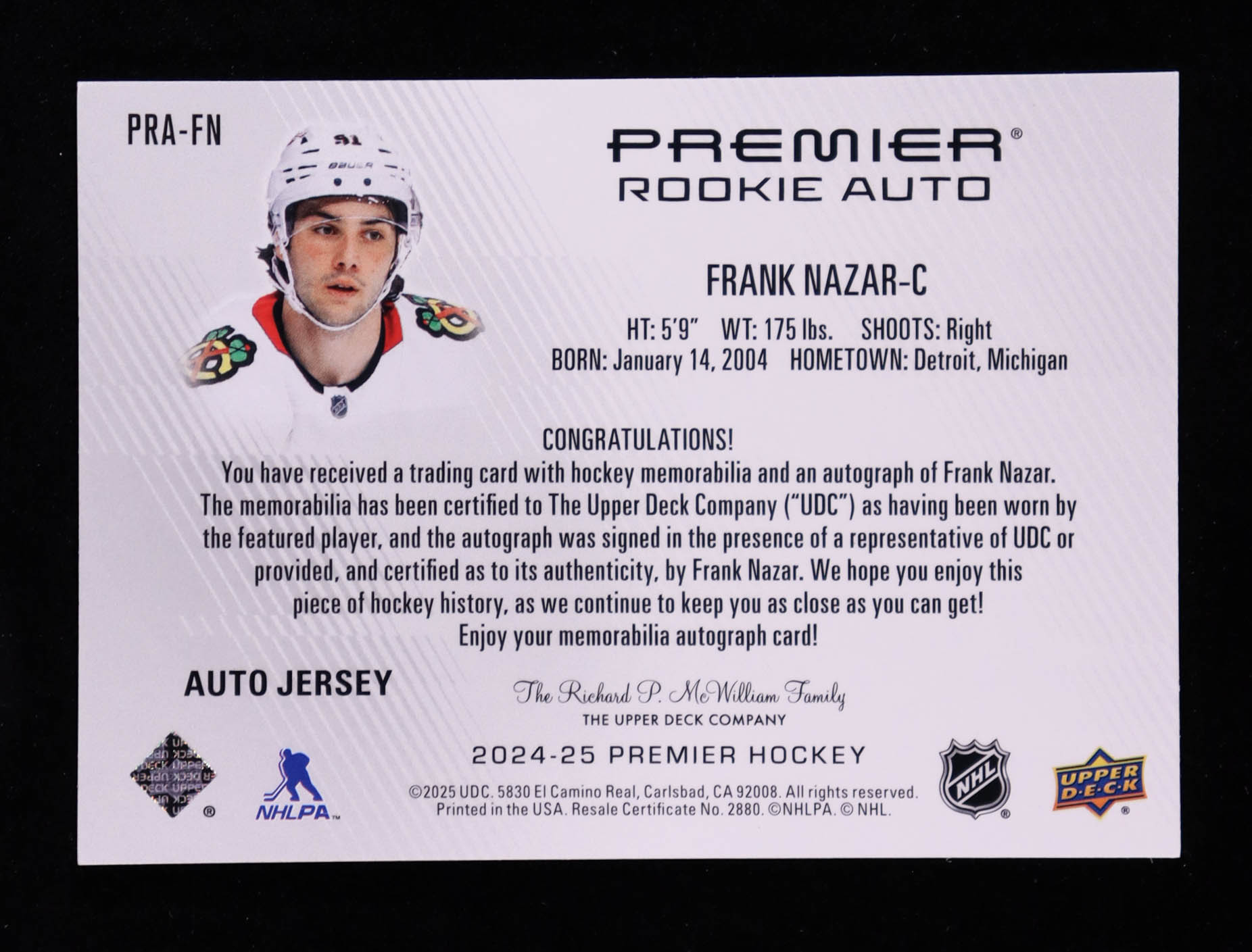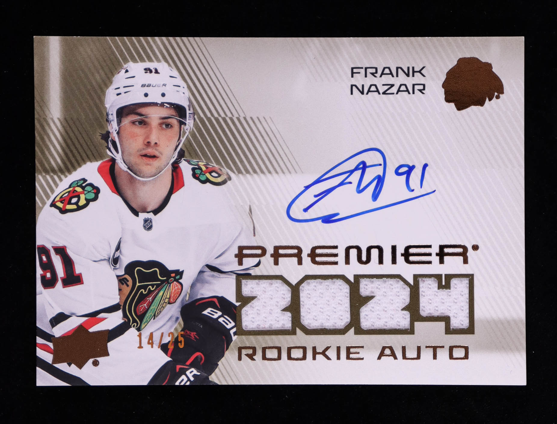 Frank Nazar 2024-25 Upper Deck Premier '24 Premier Rookie Jersey Autographs #PRAFN #14/25 RC