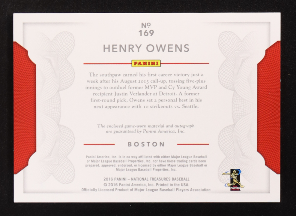Henry Owens 2016 Panini National Treasures Rookie Material Signatures Purple #169 #06/49 RC