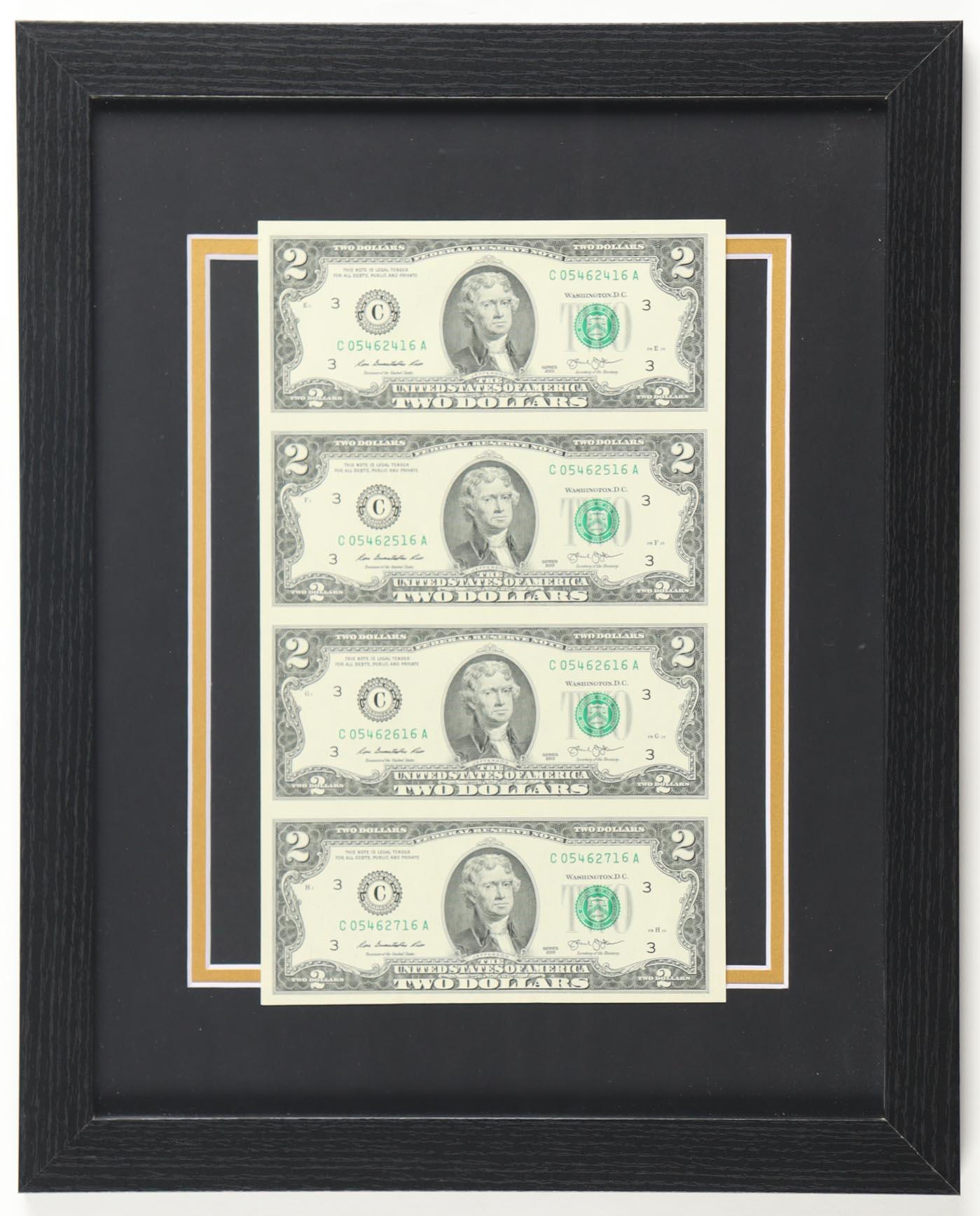 Custom frame measures approximately 13" x 16" in size and features an uncut sheet of (4) 2013 U.S. $2 dollar bills. Please note, the display is unsigned.