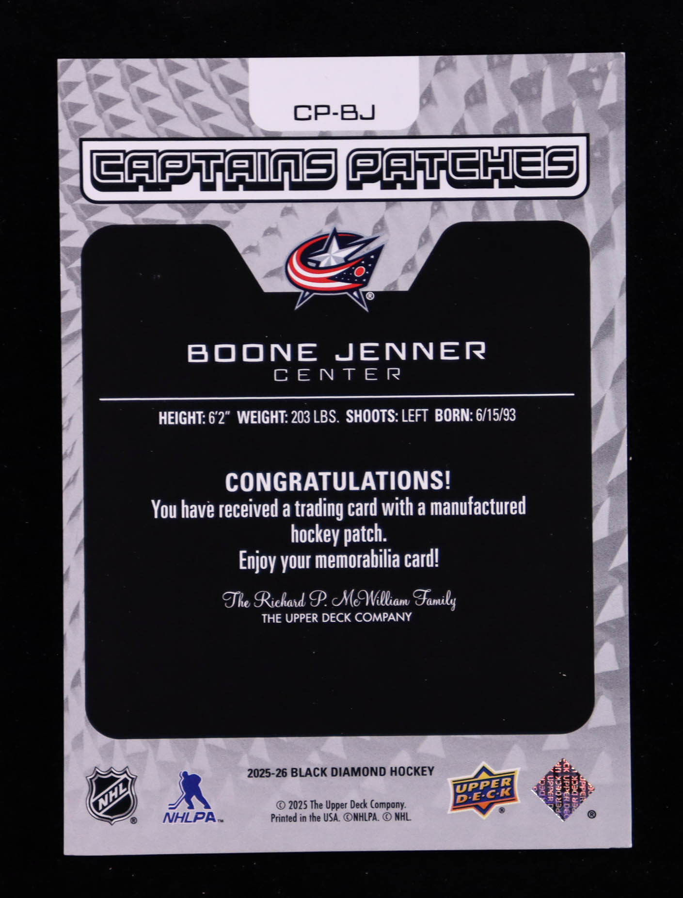 Boone Jenner 2025-26 Black Diamond Captains Patches #CPBJ #90/99