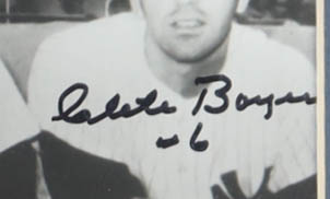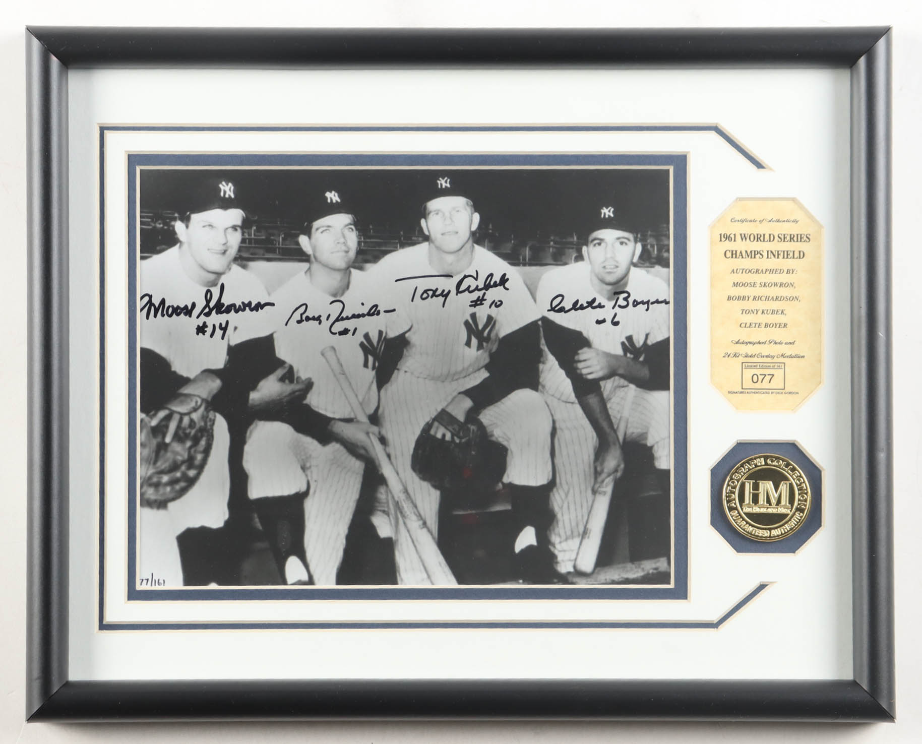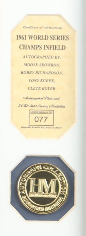 Custom Framed display measures 12" x 15" in size. Features a photo that has been hand-signed by Moose Skowron, Bobby Richardson, Tony Kubek, Clete Boyer (D. 2013, St. Louis Cardinals, HOF) and a 24Kt gold overlay medallion. This item is limited edition, numbered 77 out of 161. Please note, the frame has some minor scratches.