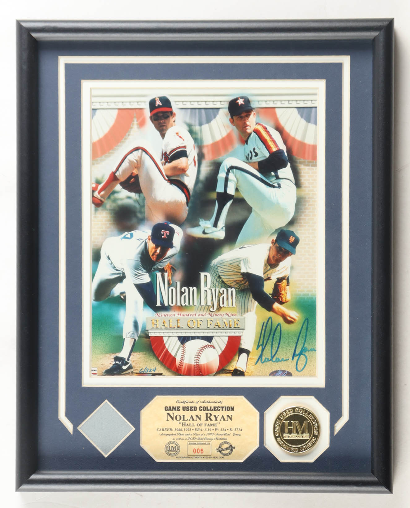 Nolan Ryan Signed LE Hall of Fame Custom Framed Photo Display With Game-Used Jersey Swatch & 24Kt Gold Overlay Medallion (Highland Mint & Ryan)