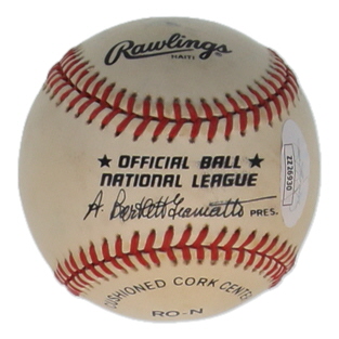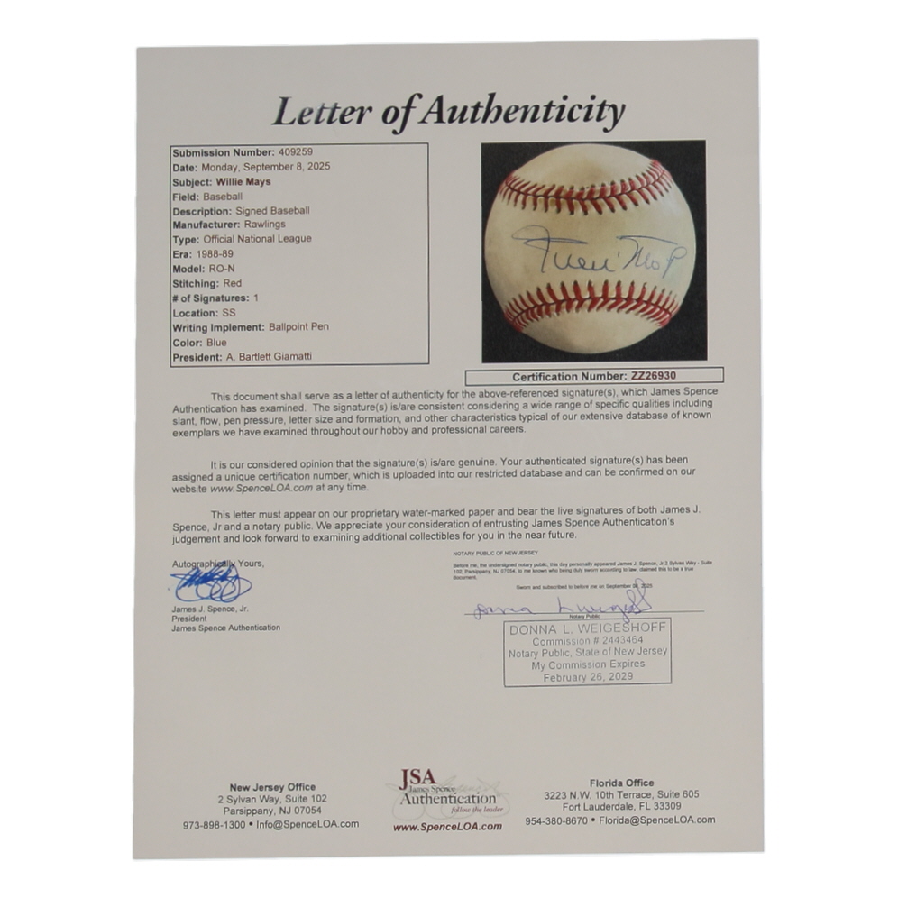 Rawlings Official National League Baseball. Hand-signed by Willie Mays (D. 2024, San Francisco Giants, HOF). Please note, the signature has been smudged and the baseball is naturally toning and stained.