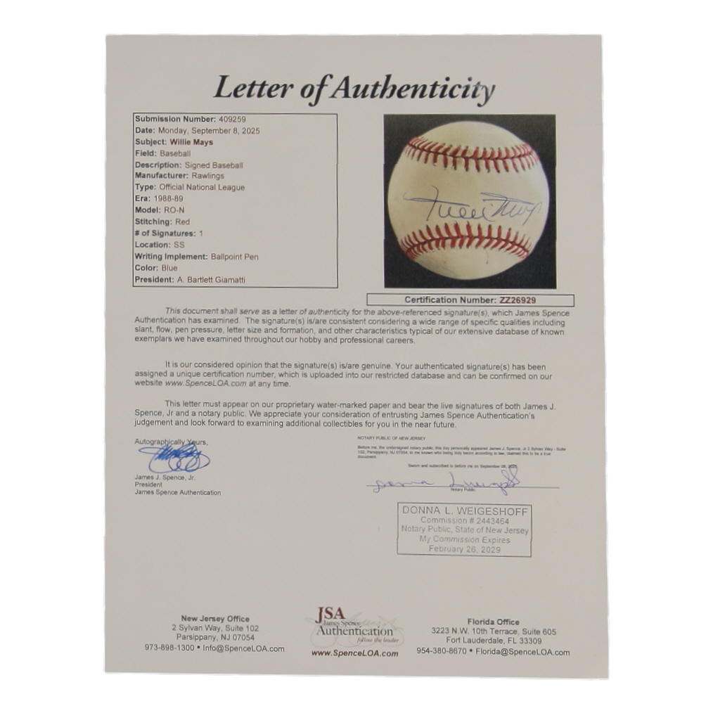 Rawlings Official National League Baseball. Hand-signed by Willie Mays (D. 2024, San Francisco Giants, HOF). Please note, the baseball is naturally toning and stained.