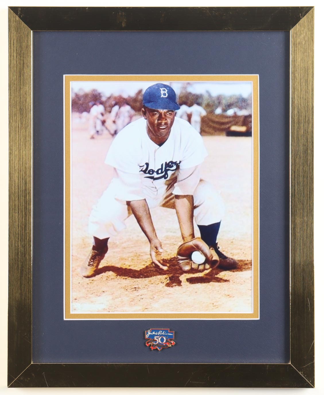 Jackie Robinson Dodgers Custom Framed Colorized Art Print Display with Robinson 50th Anniversary Pin