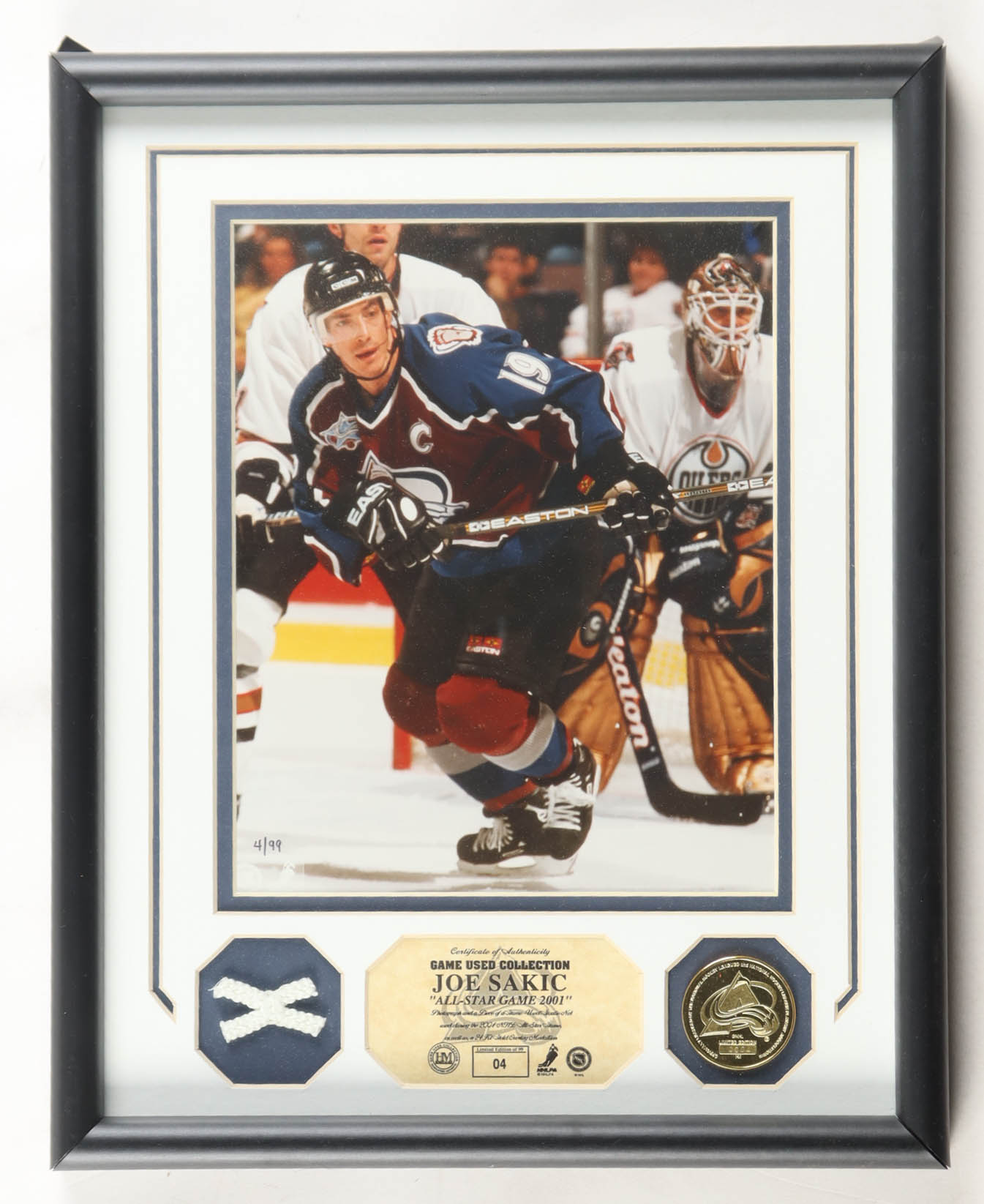 Custom frame measures approximately 13" x 16" in size. Display includes a piece of a game-used net and 24kt gold overlayed medallion. Limited edition #4/99.