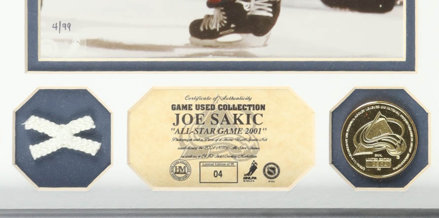 Joe Sakic LE Custom Framed Game-Used Net Piece Display With 24kt Gold Overlay Medalion (Highland Mint)
