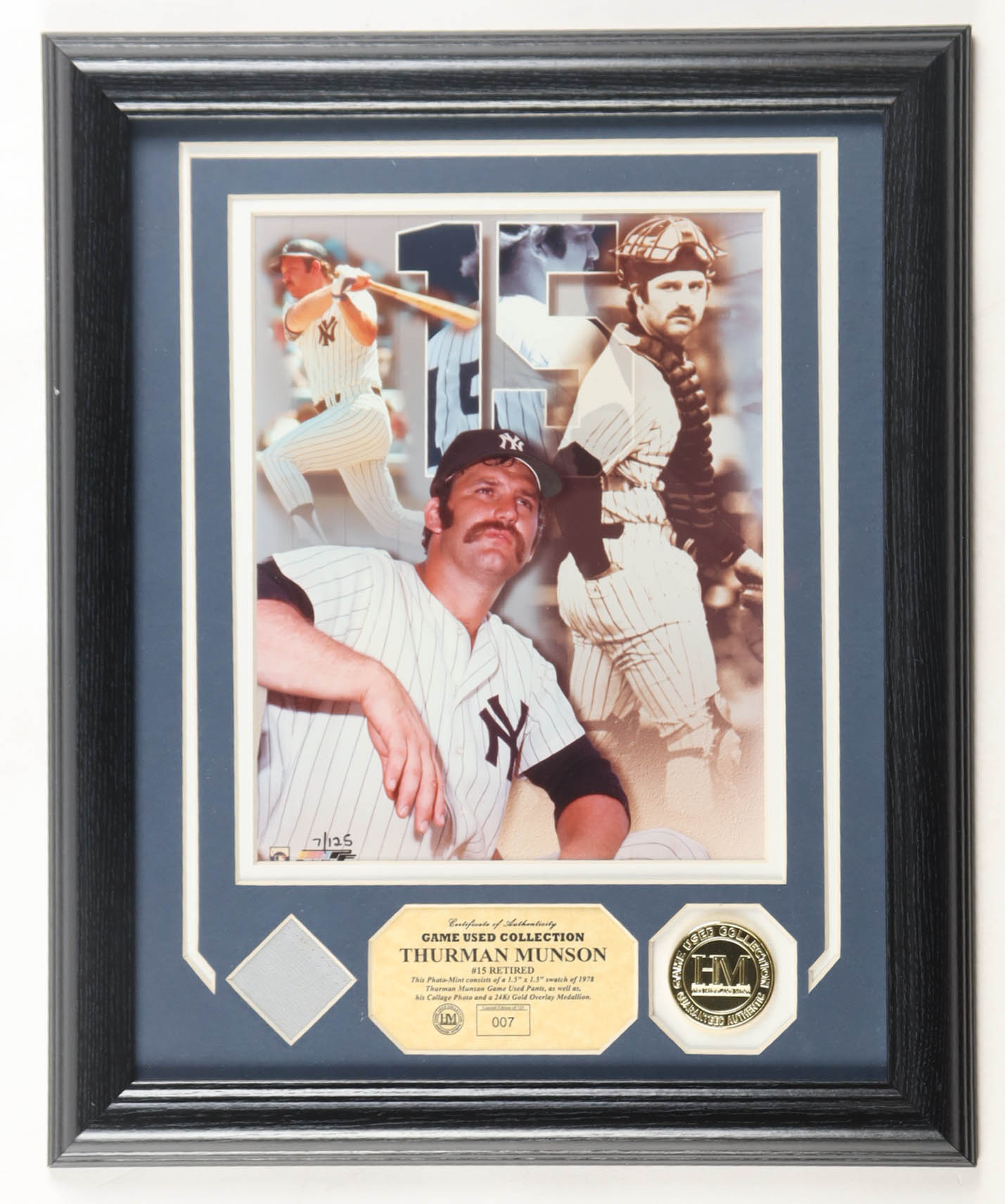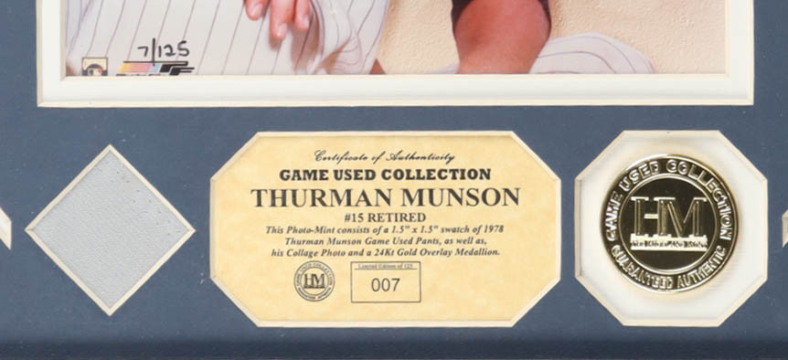 Custom Framed display measures 13" x 16" in size. Features an unsigned photo of Thurman Munson (D. 1979, New York Yankees) and a game-used pant swatch and 24Kt gold overlay medallion. This item is limited edition, numbered 7 out of 125. Please note, the frame has some minor scratches.