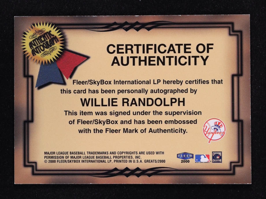 Willie Randolph 2000 Greats of the Game Autographs #NNO