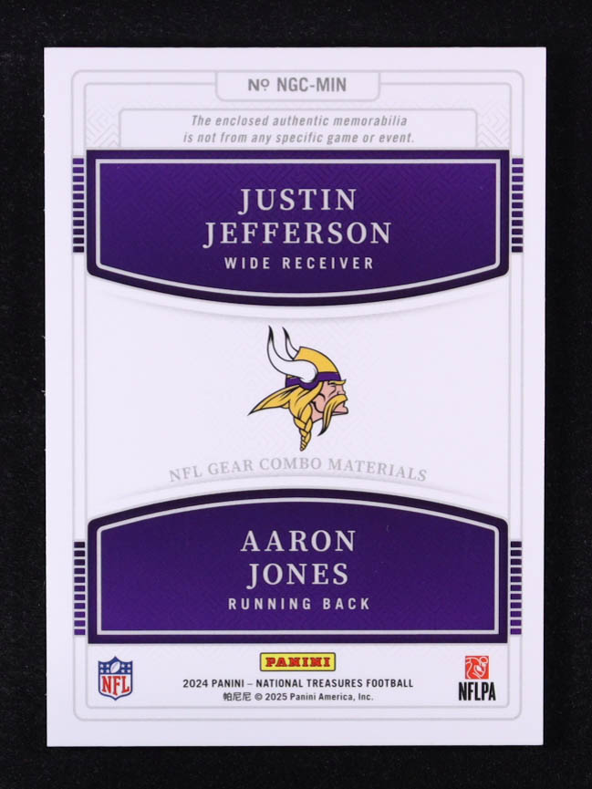 Justin Jefferson / Aaron Jones 2024 Panini National Treasures NFL Gear Combo Materials #20 #63/99