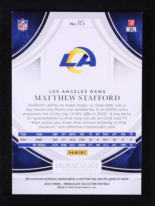 Matthew Stafford 2025 Immaculate Collection Red #85 JSY #62/75