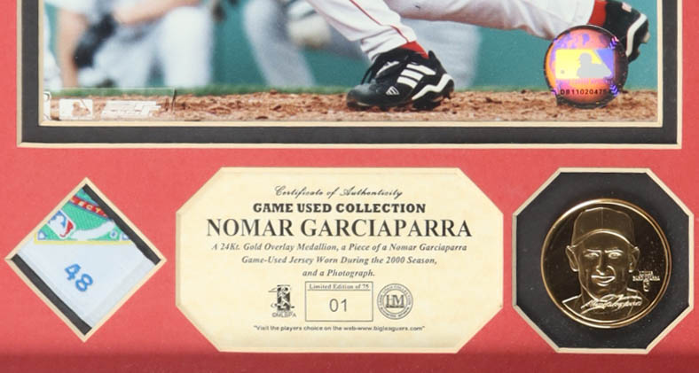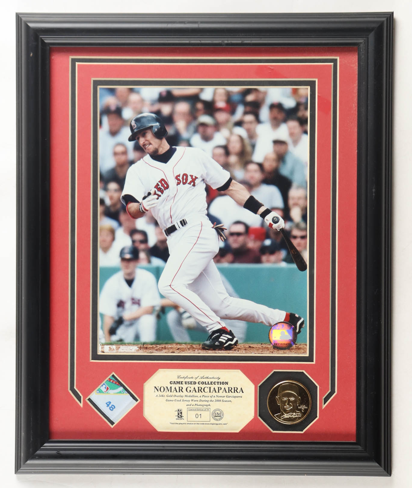 Custom Framed display measures 13" x 16" in size. Features an unsigned photo of Nomar Garciaparran (Boston Red Sox) and a game-used jersey swatch and 24Kt gold overlay medallion. This item is limited edition, numbered 1 out of 75. Please note, the frame has some minor scratches.