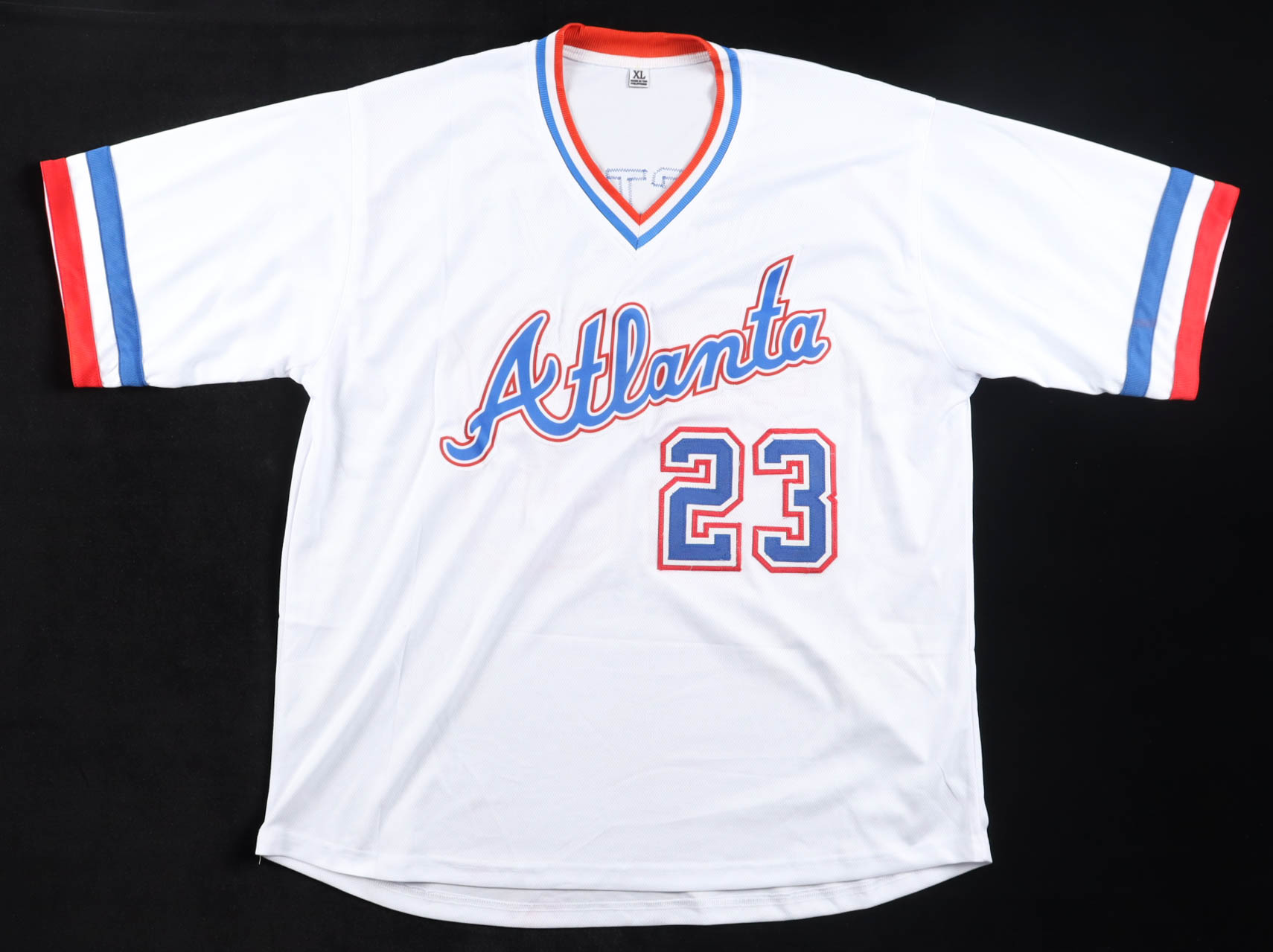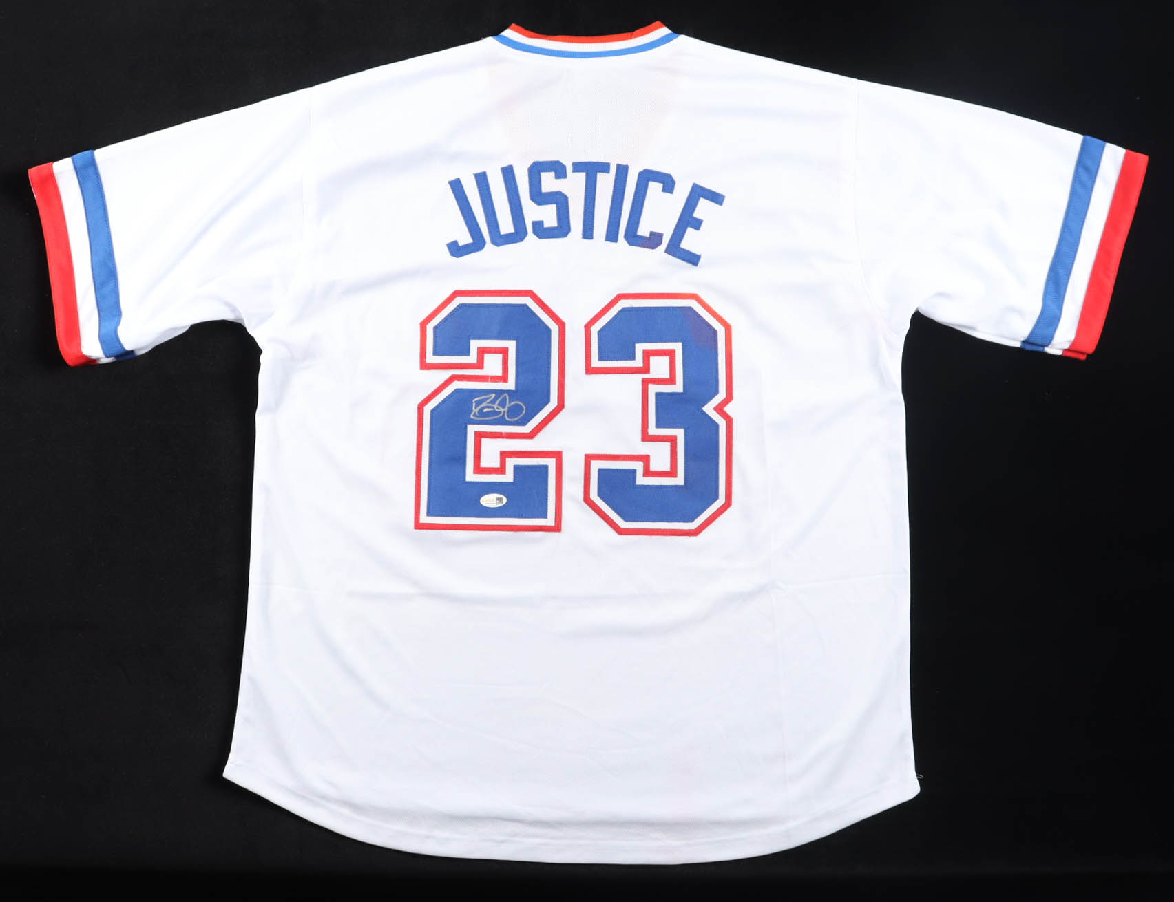 Custom jersey with everything sewn on, size XL. Hand-signed by David Justice.
