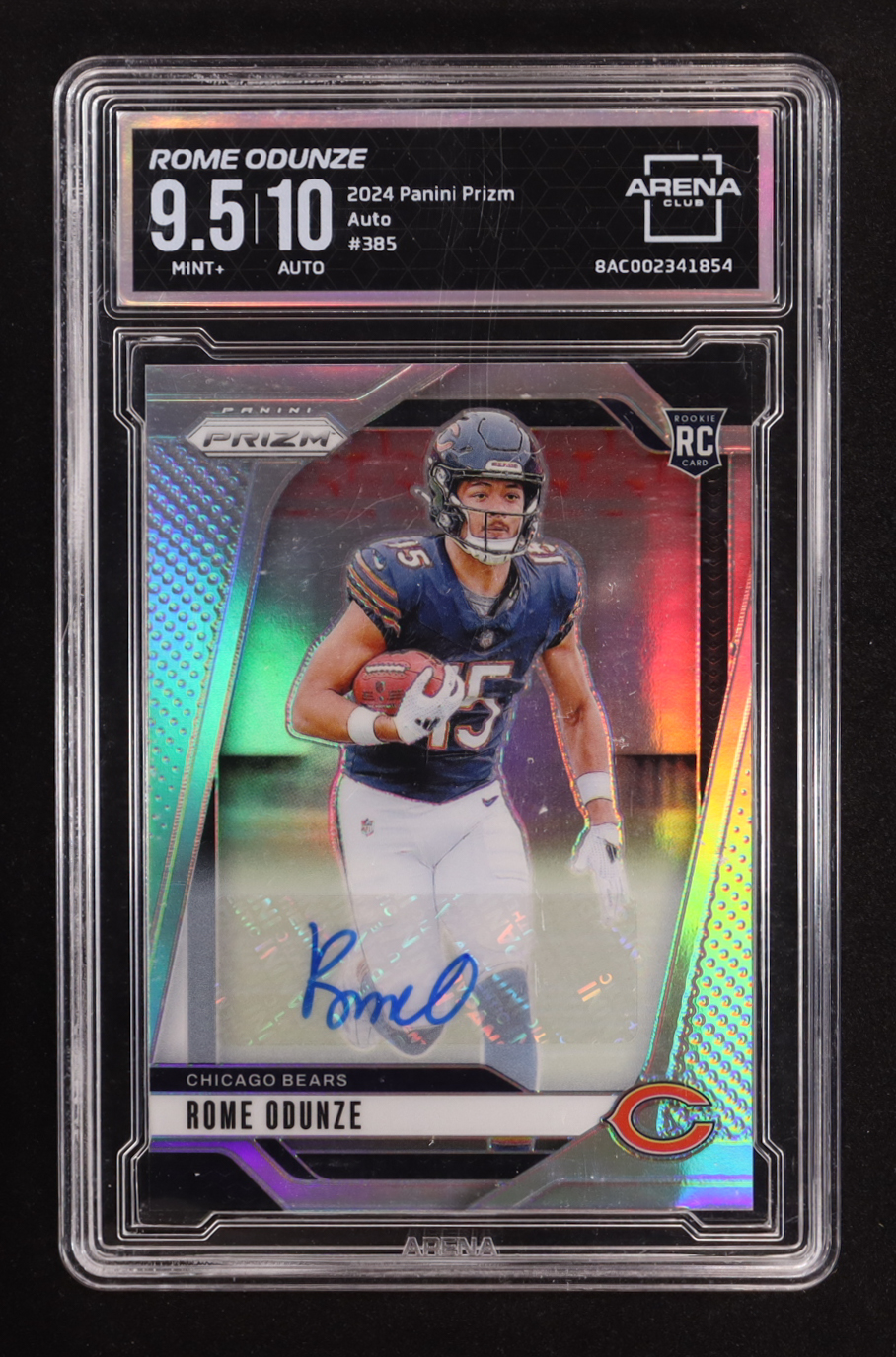 Card has been hand-signed by Rome Odunze. Card has been graded (Arena Club) 9.5 | Autograph Graded 10. Please see photos for more details regarding the condition of the card (Chicago Bears).