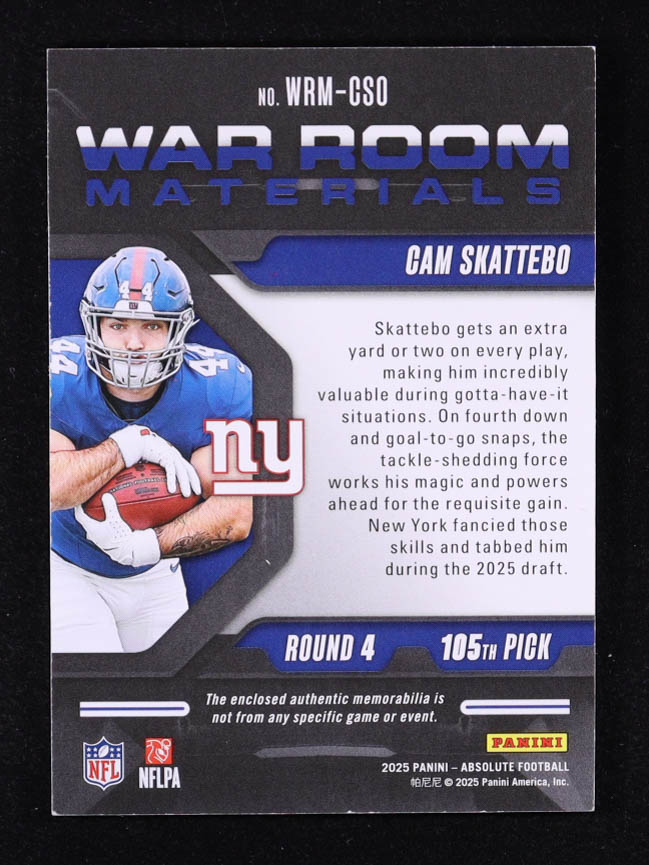 Cam Skattebo 2025 Absolute War Room Materials Gold #4 RC #91/99
