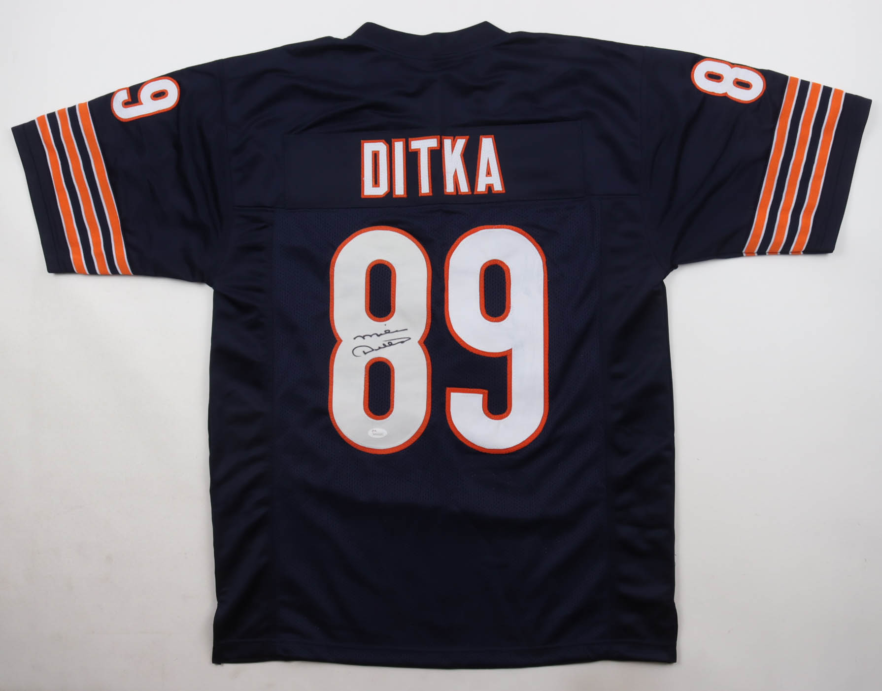 Custom jersey with everything sewn on, size XL. Hand-signed by Mike Ditka (HOF). Please note, glue is visible through the jersey numbers.