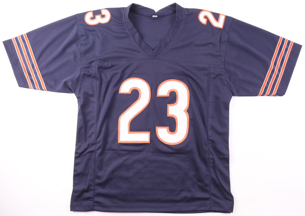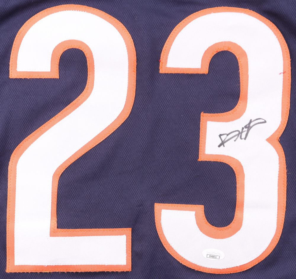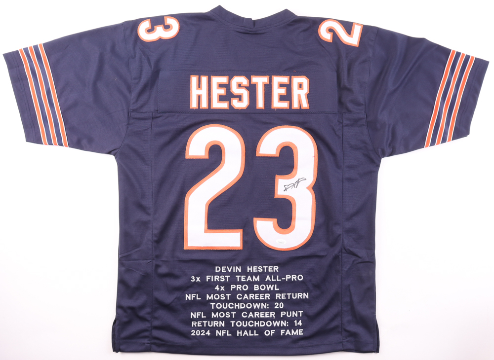 Custom jersey. Everything is sewn on, size XL. Has been hand-signed by Devin Hester. Hester's career highlights have been custom stitched onto the back of the jersey below the reverse numbers.