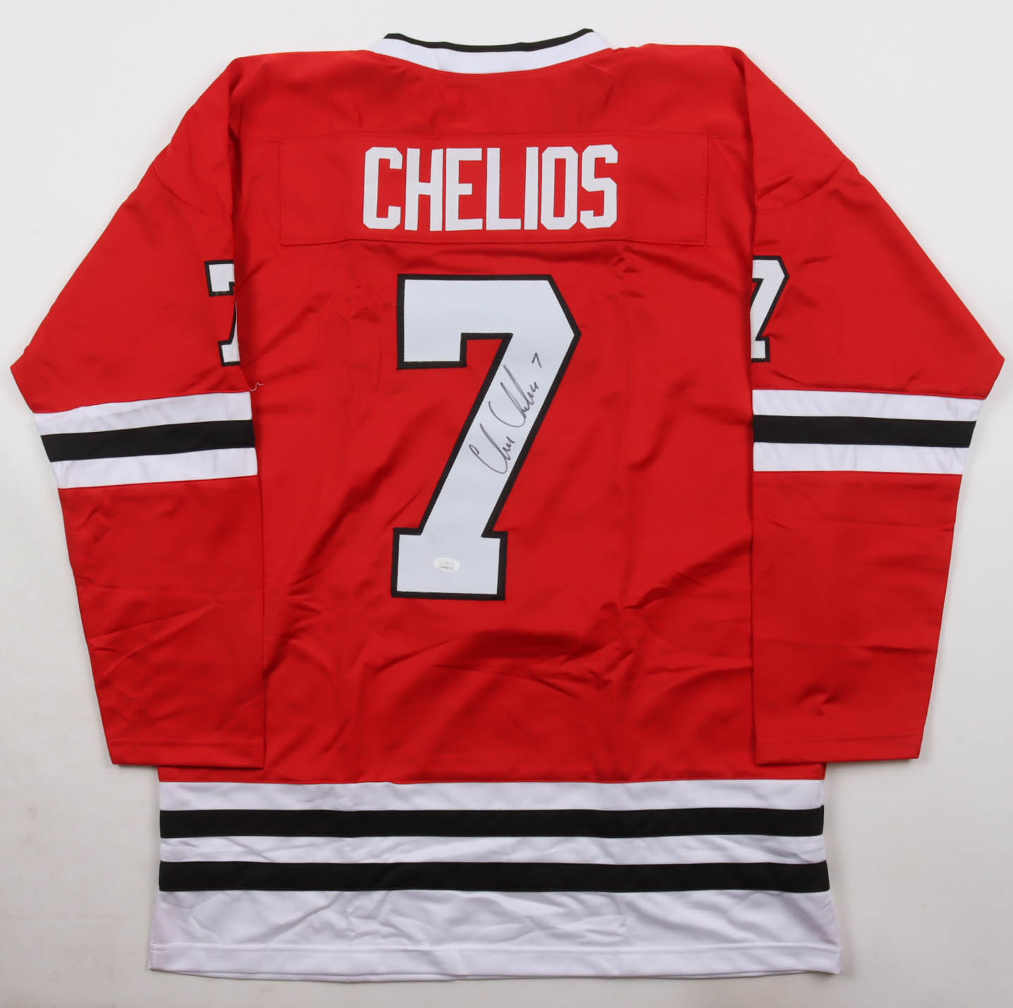 Custom jersey with everything sewn on, size XL. Hand-signed by Chris Chelios (HOF).
