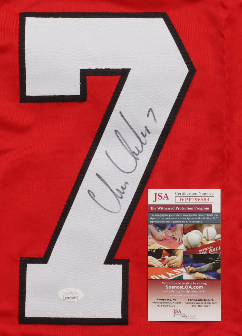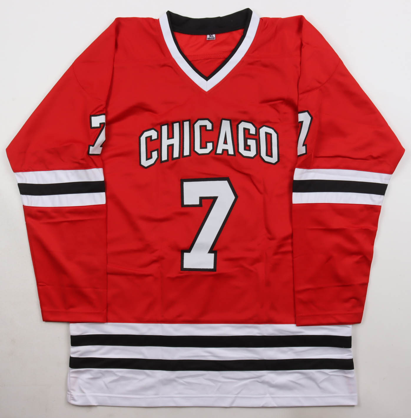 Custom jersey with everything sewn on, size XL. Hand-signed by Chris Chelios (HOF).