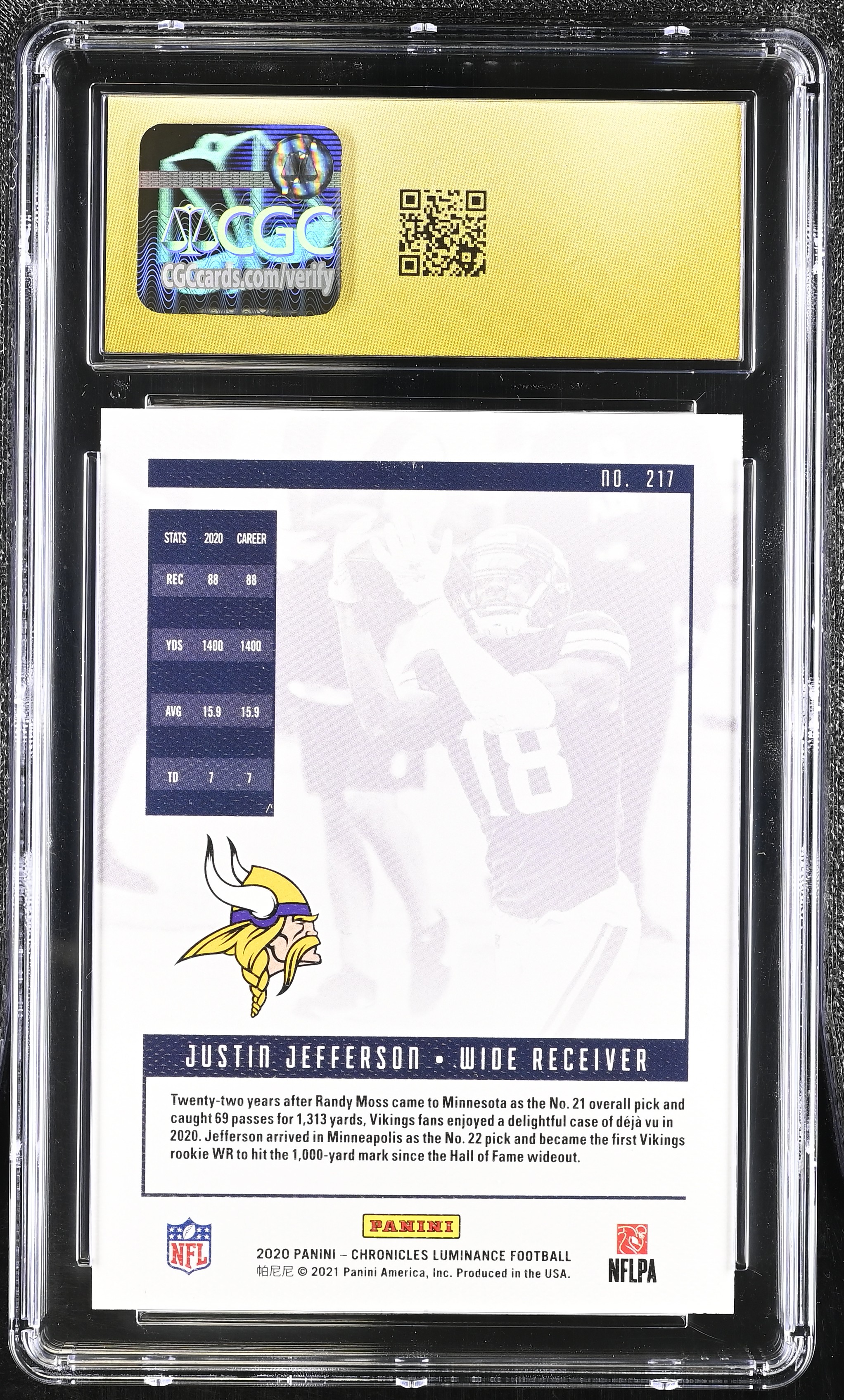 Justin Jefferson 2020 Panini Luminance CHRONICLES #217 RC (CGC 10 | Black Label)