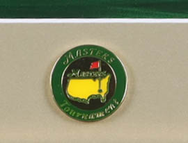 Custom framed display measures approximately 13" x 16" in size and features a photo as well as a vintage Masters Tournament pin. Please note that the item is unsigned.
