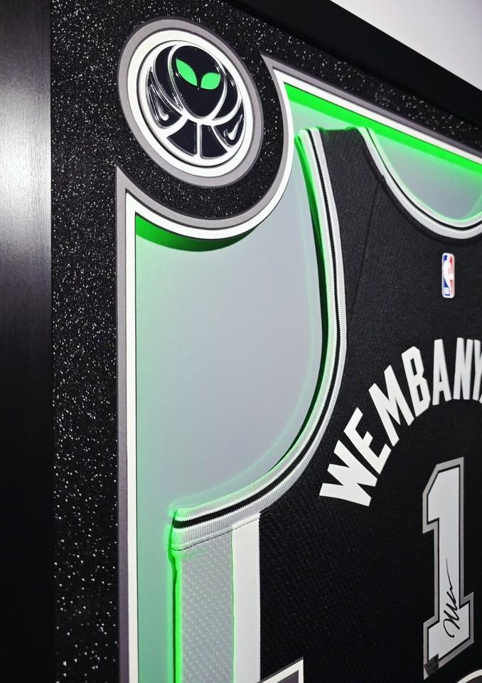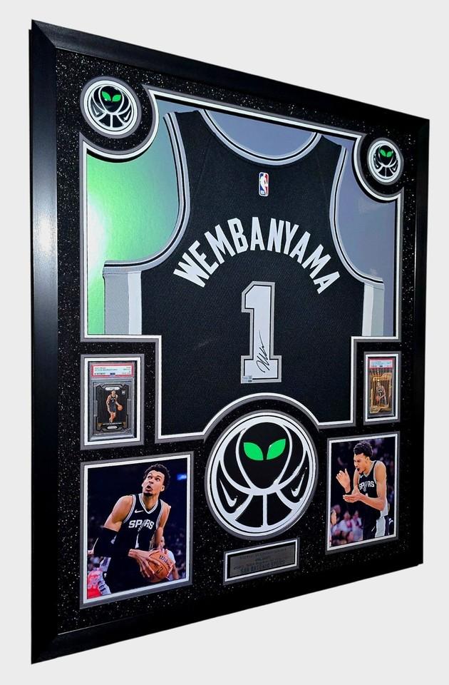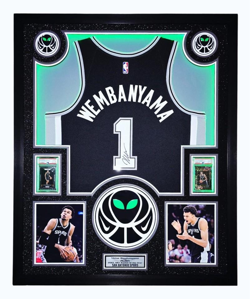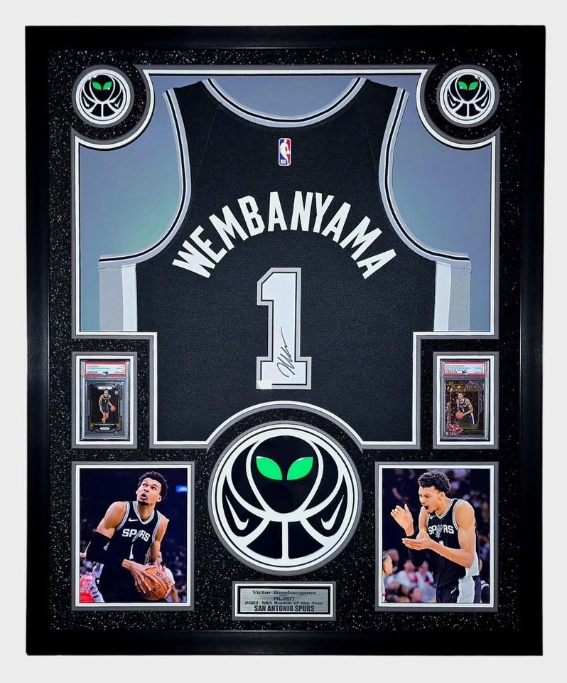 Custom frame measures 42" x 33" in size and features a Nike jersey that has been hand signed by Victor Wembanyama (San Antonio Spurs).