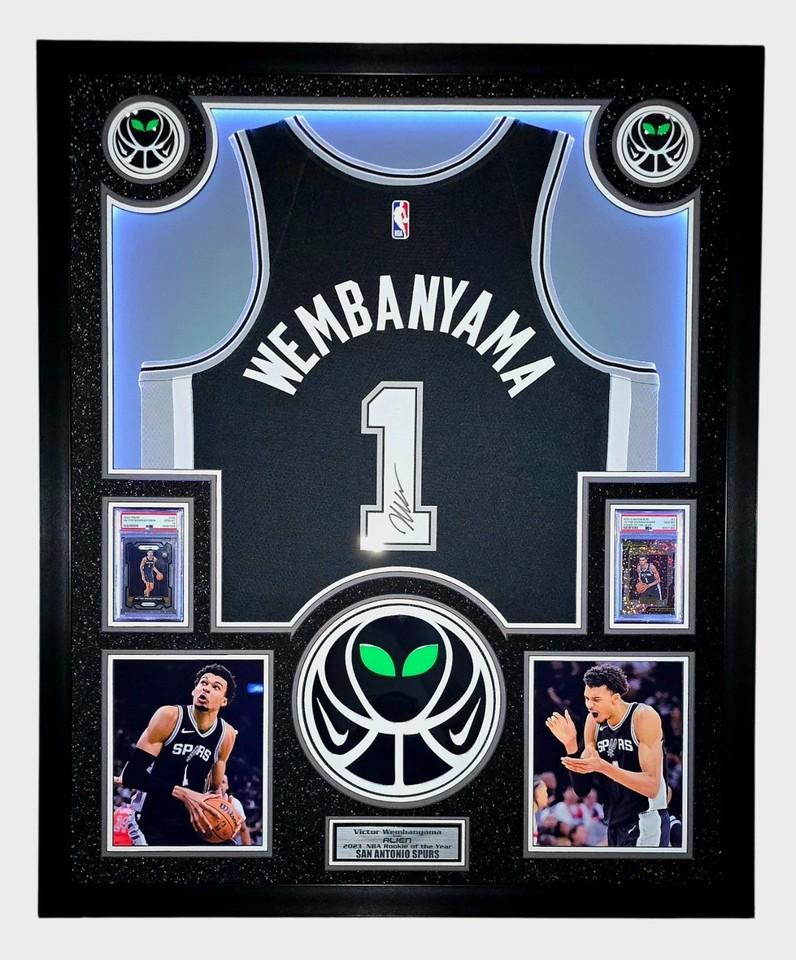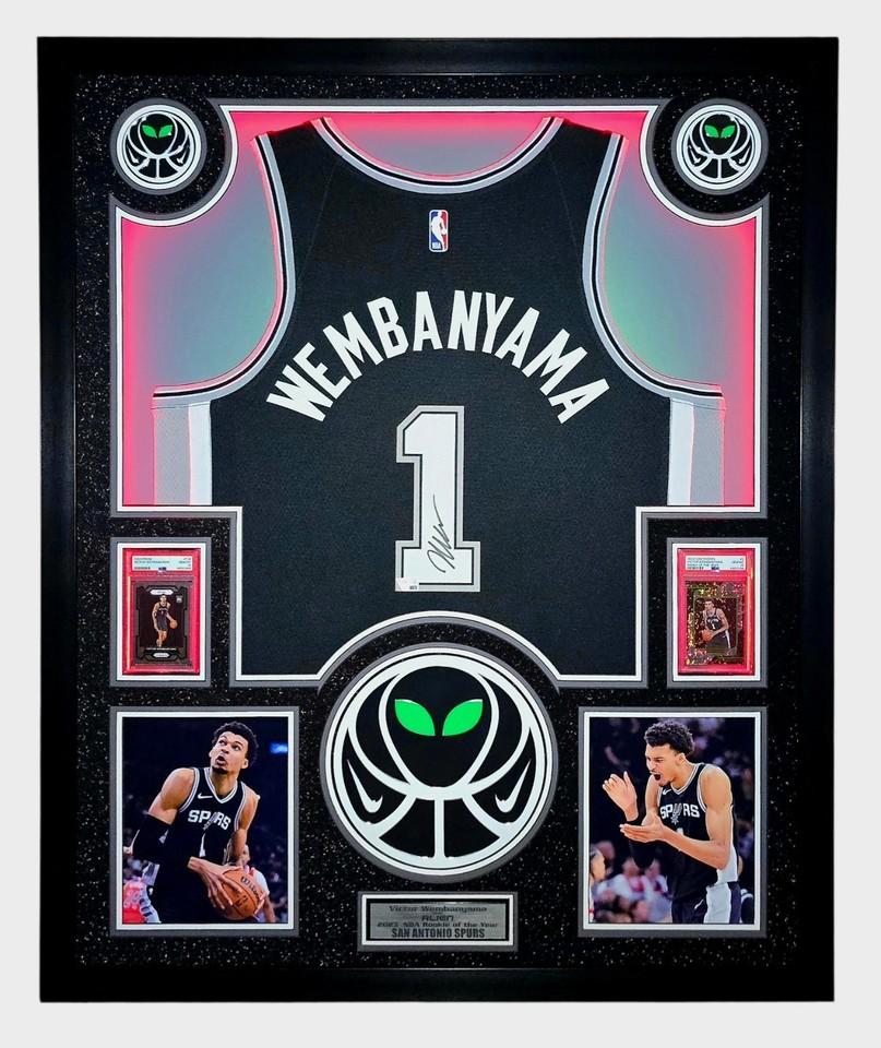 Victor Wembanyama Signed Spurs Custom Framed Nike Jersey with LED Display & (2) PSA 10 Graded Rookie Cards (Fanatics)