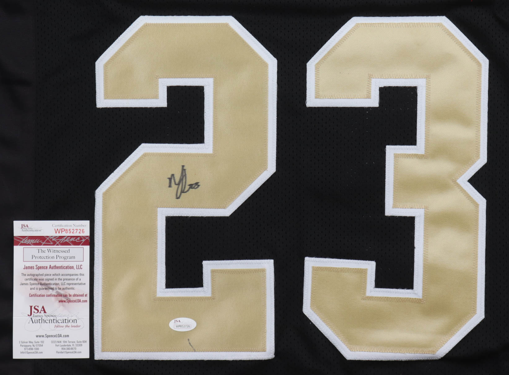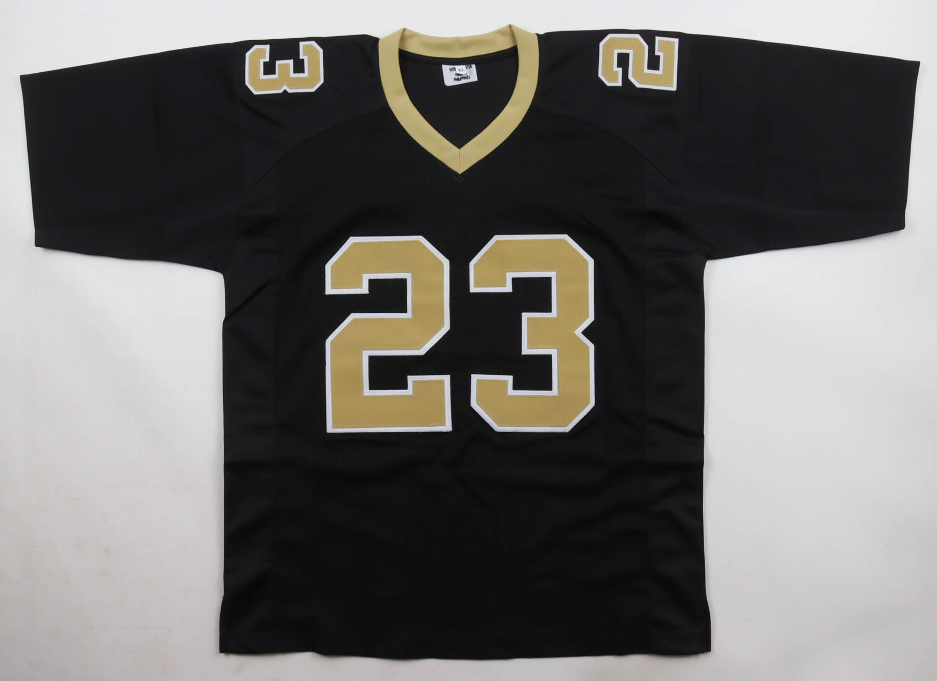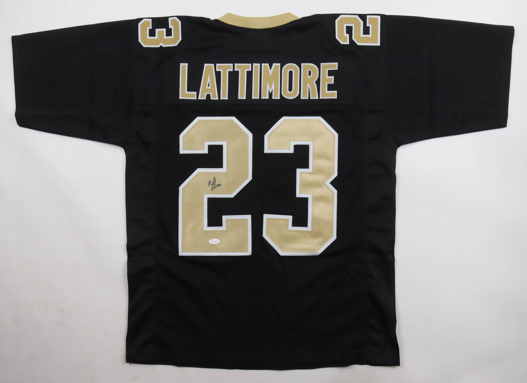 Custom jersey with everything sewn on, size XL. Hand-signed by Marshon Lattimore. Please note, there is a stray ink mark below the hologram.