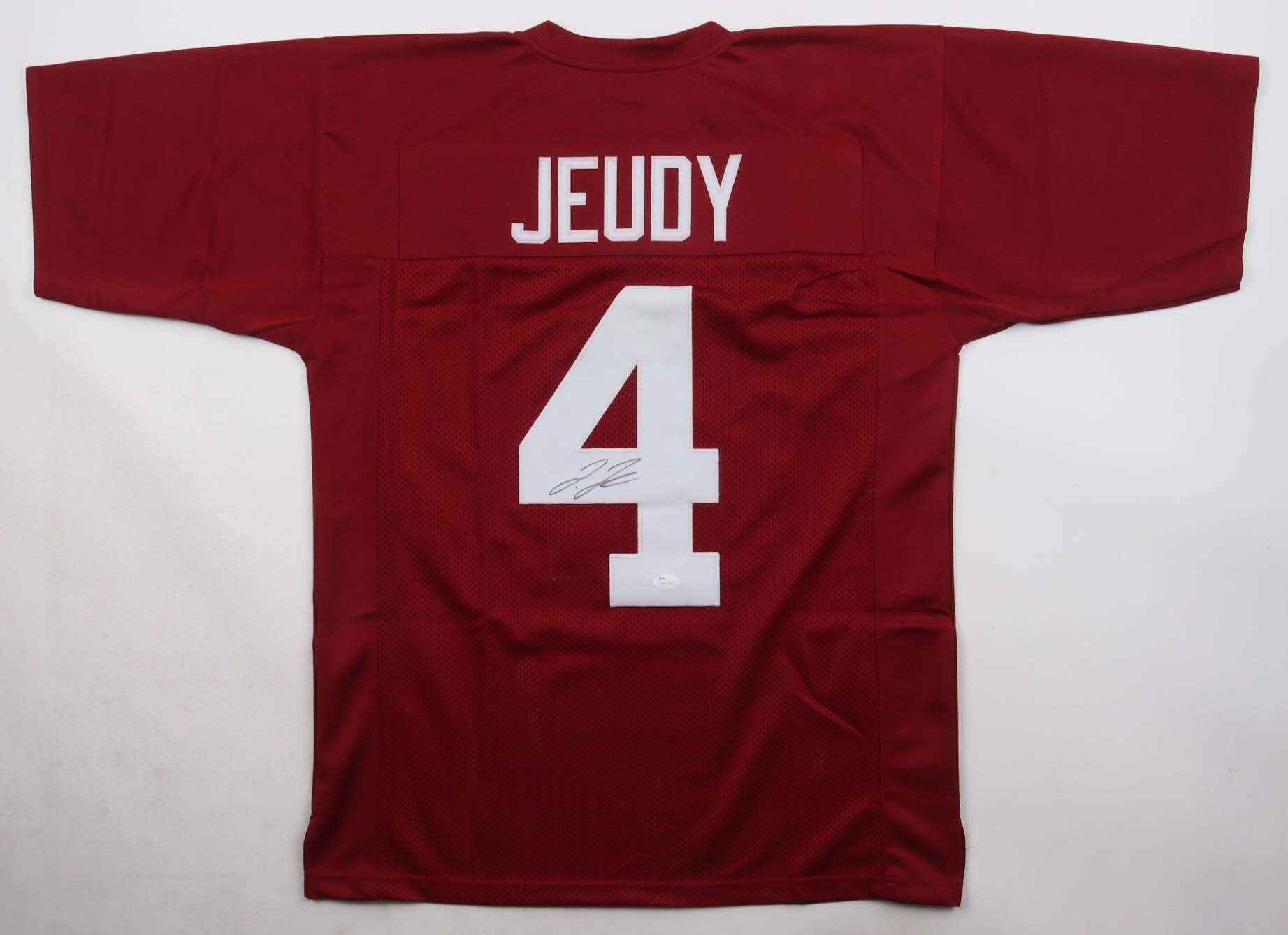 Custom jersey with everything sewn on, size XL. Hand-signed by Jerry Jeudy. Please note, glue is visible through the jersey numbers. See photos regarding the condition of the item.
