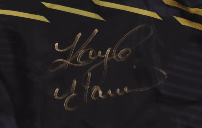 Custom shorts with everything printed on, size XL. Hand-signed by Kayla Harrison