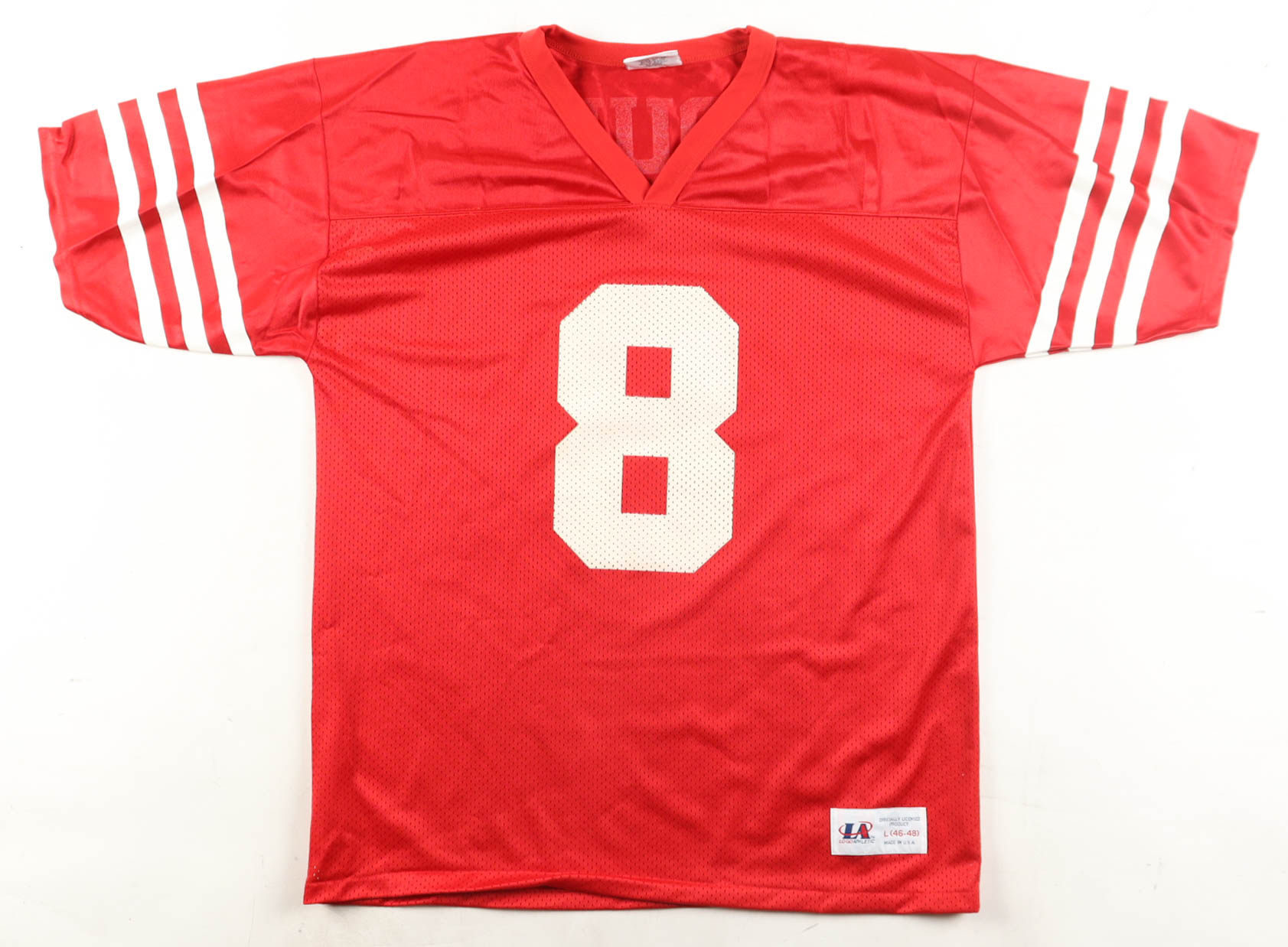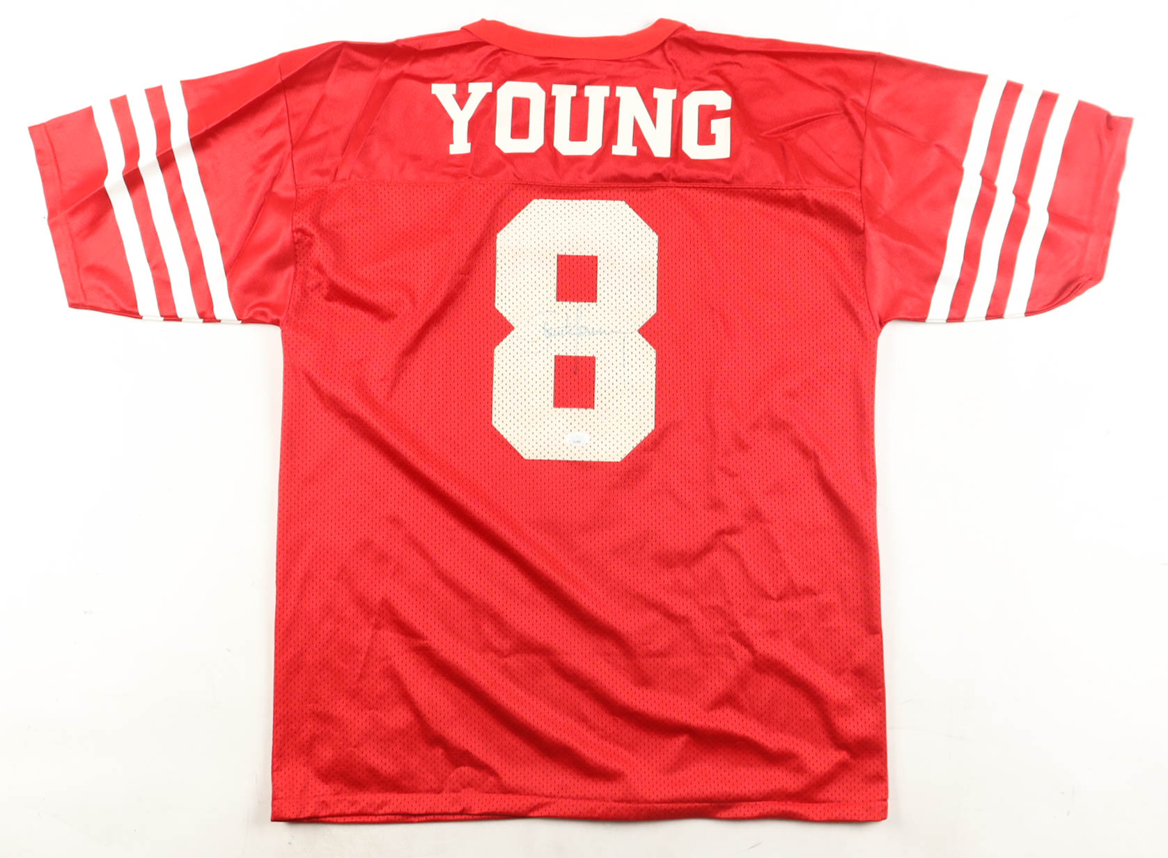 Logo Athletic jersey with everything printed on, size L. Hand-signed by Steve Young. Please note, there is a stain on the reverse number.