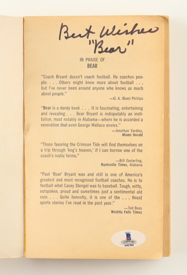 Paul Bryant Signed "Bear" Paperback Book Inscribed "Best Wishes" (Beckett)