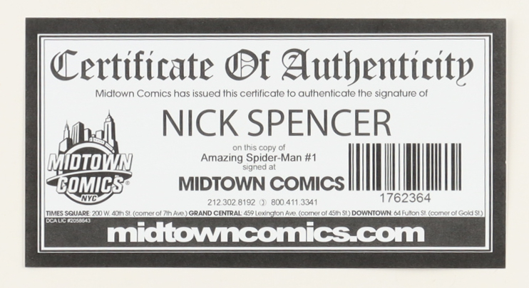 Nick Spencer Signed 2018 "The Amazing Spider-Man" Issue #1 Marvel Comic Book (Midtown Comics)