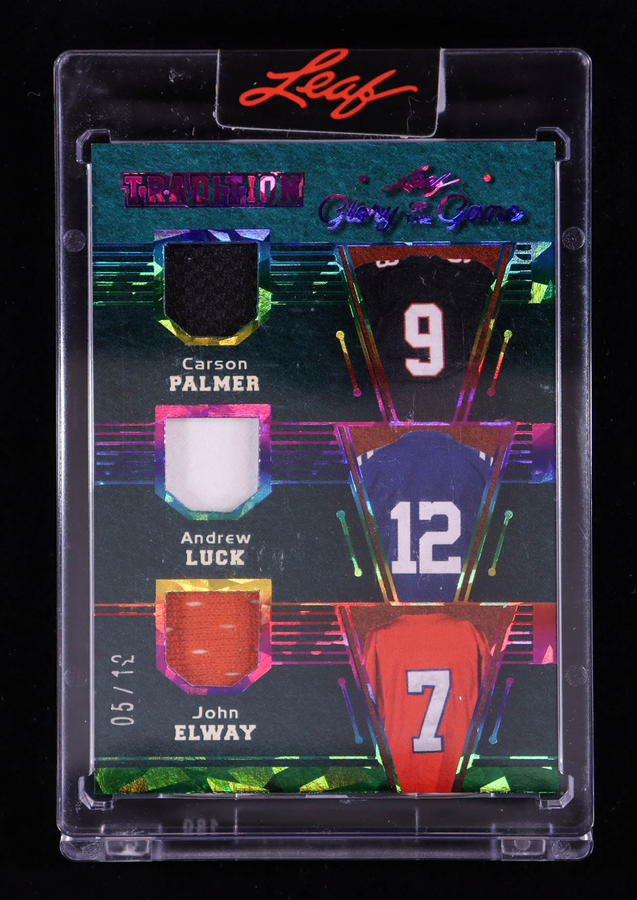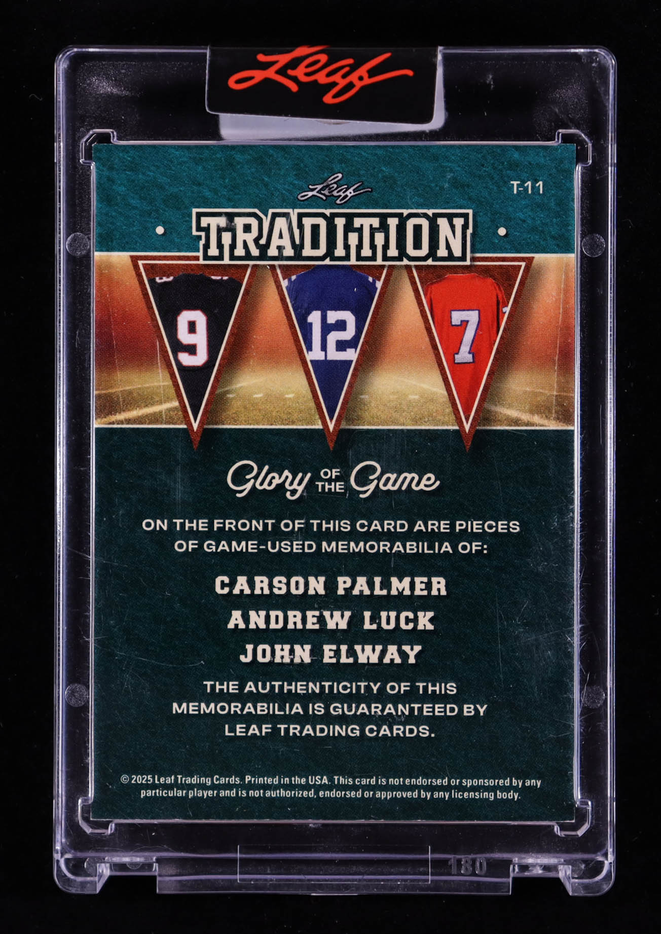 Carson Palmer / Andrew Luck / John Elway 2025 Leaf Glory of the Game Tradition Jerseys Holo Rainbow #T11 #05/12