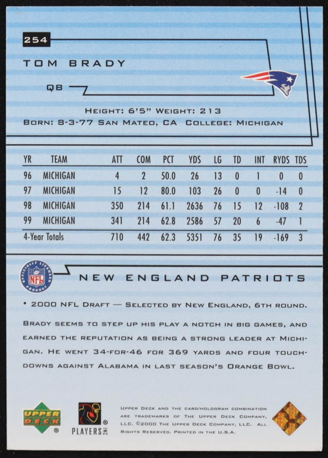 Tom Brady 2000 Upper Deck #254 RC