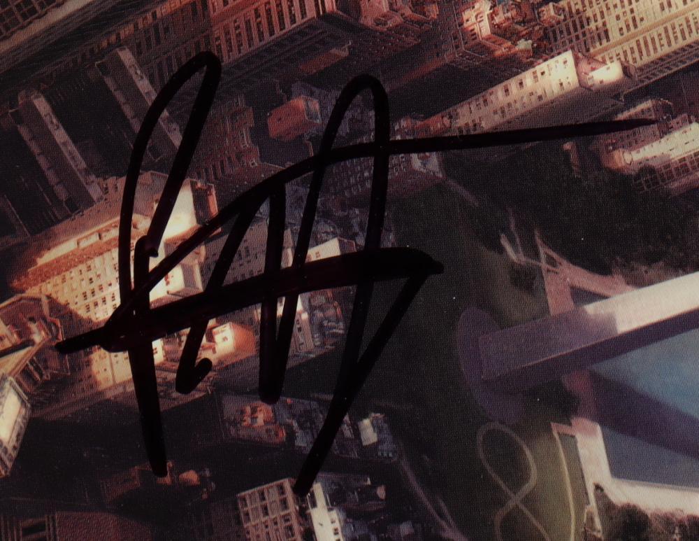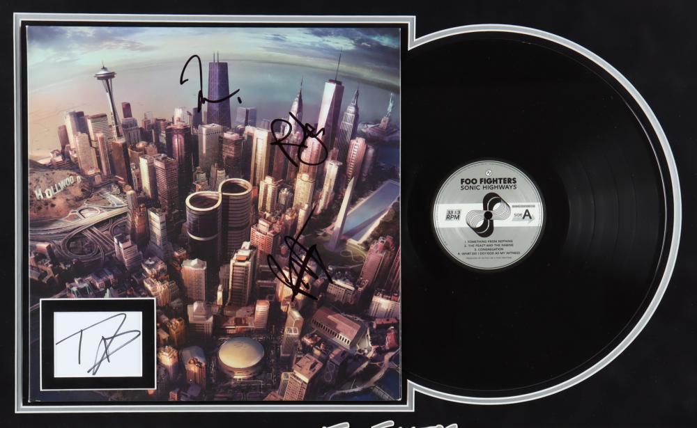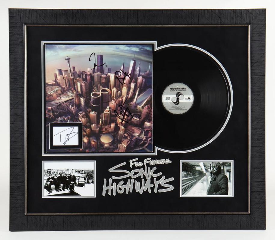 Custom framed display measures approximately 25.5" x 29.5" in size. Features a "Sonic Highways" record that has been hand-signed on the sleeve by Taylor Hawkins, Nate Mendel and Pat Smear. Display features a cut hand-signed by Dave Grohl.