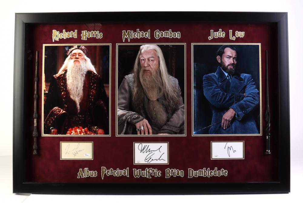 Custom frame measures 27" x 41" in size and features a cut that has been hand-signed by Michael Gambon (Albus Dumbledore), Jude Law (Albus Dumbledore) and Richard Harris (Albus Dumbledore). Display also features (2) movie prop wands.
