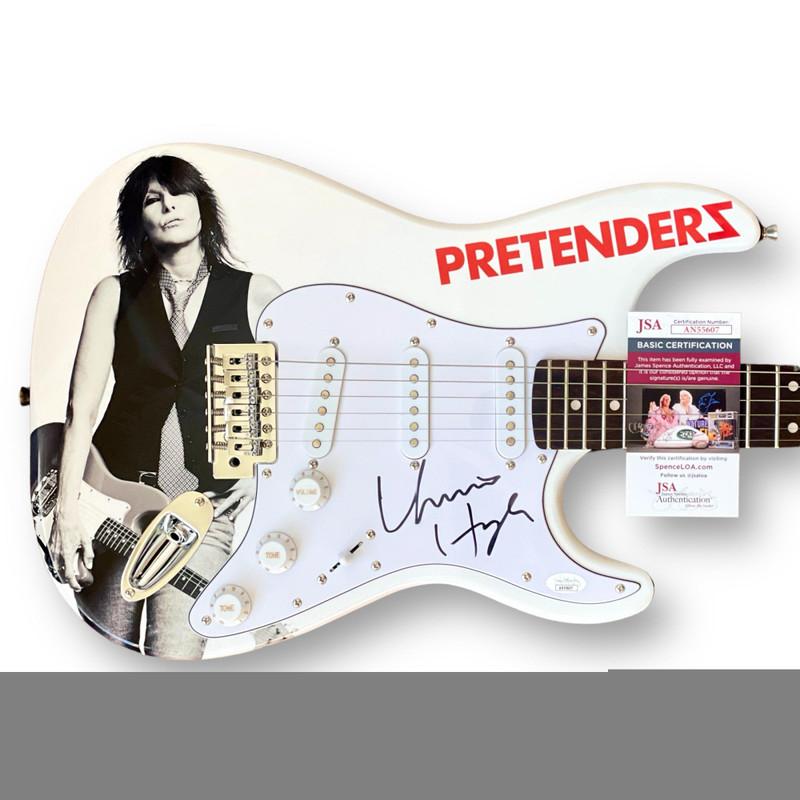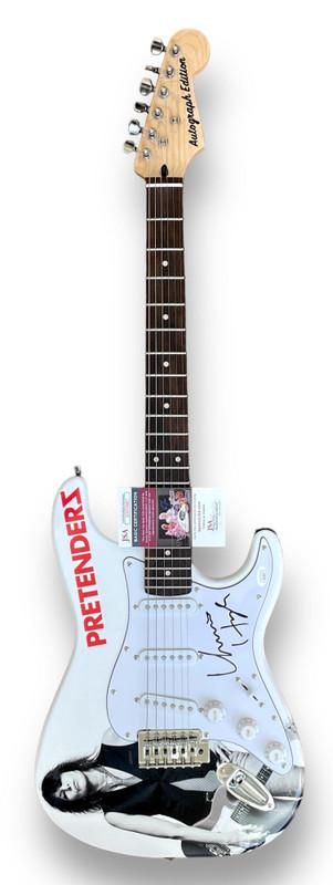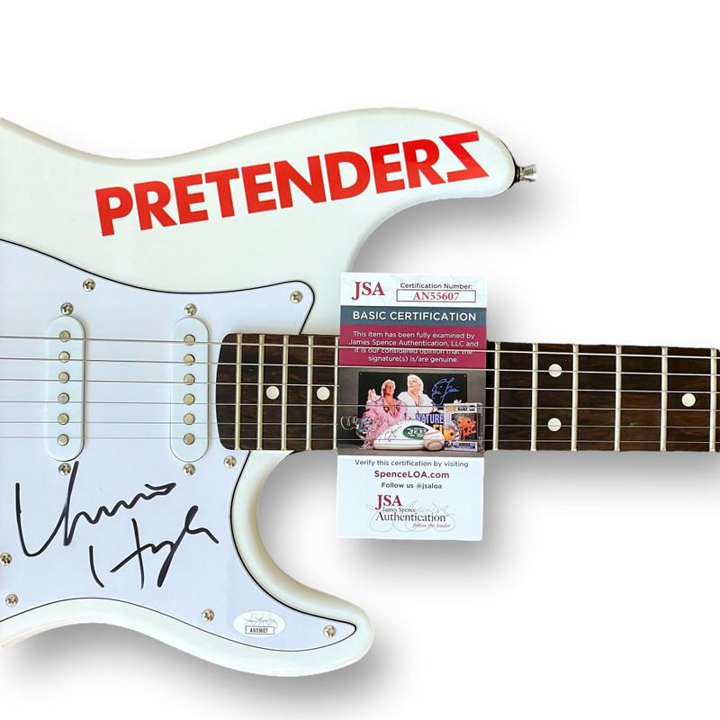 Custom Stratocaster style electric guitar measures approximately 39" in length and has been hand-signed on the pickguard by lead signer and guitarist Chrissy Hynde.