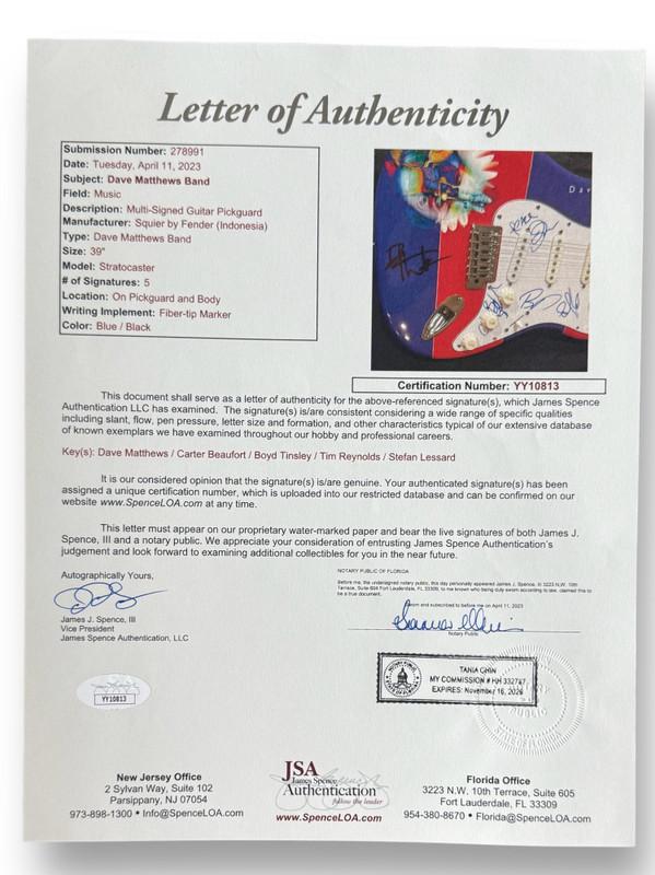 Custom Fender Squire Dave Matthews Band Stratocaster electric guitar measures approximately 39" in length and has been hand-signed on the body by Dave Matthews, Carter Beauford, Stefan Lessard, Boyd Tinsley and Tim Reynolds.