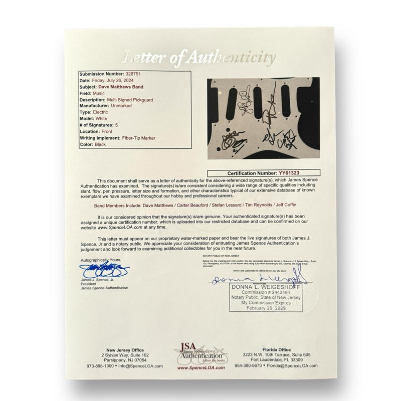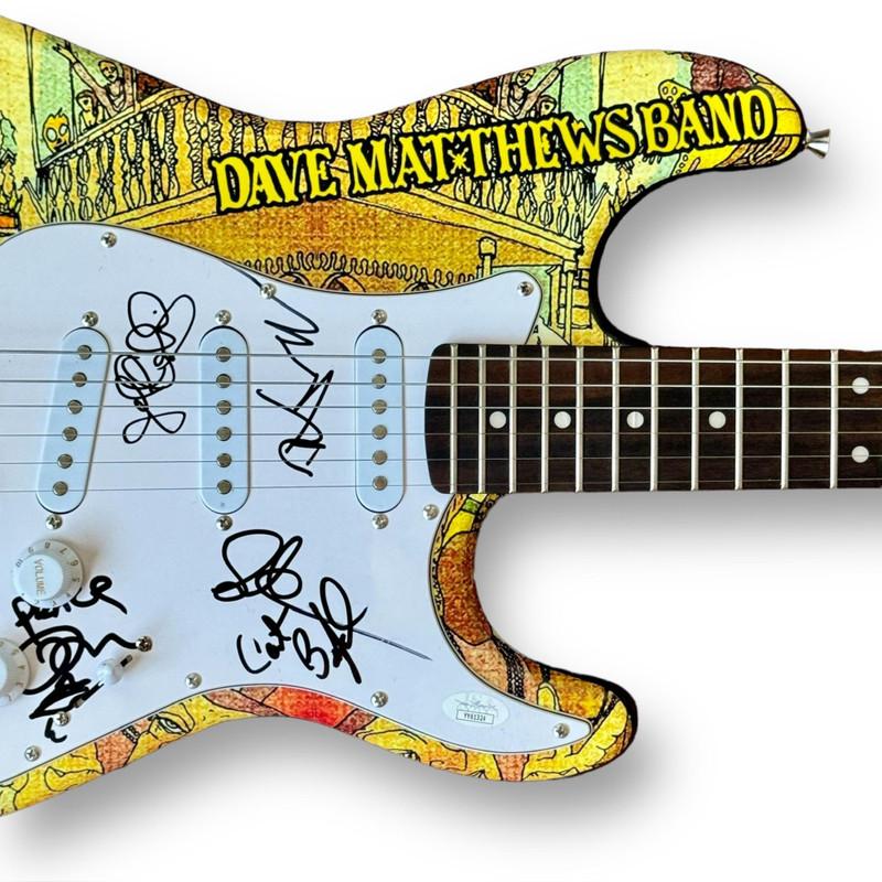Squier by Fender Stratocaster custom guitar measures 38" in length. Band-signed by (5) Dave Matthews, Carter Beaufort, Boyd Timsley, Tim Reynolds and Stefan Lessard. Please note, Matthews has signed on the body of the guitar.