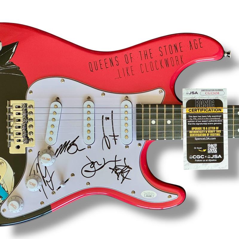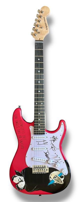Custom Autograph Edition Stratocaster style electric guitar measures approximately 39" in length and has been hand-signed on the pickguard by Josh Homme (Lead Singer), Troy Van Leeuwen (Lead Guitarist), Michael Shuman (bassist), Dean Fertita (keyboardist), and Jon Theodore (Drummer).