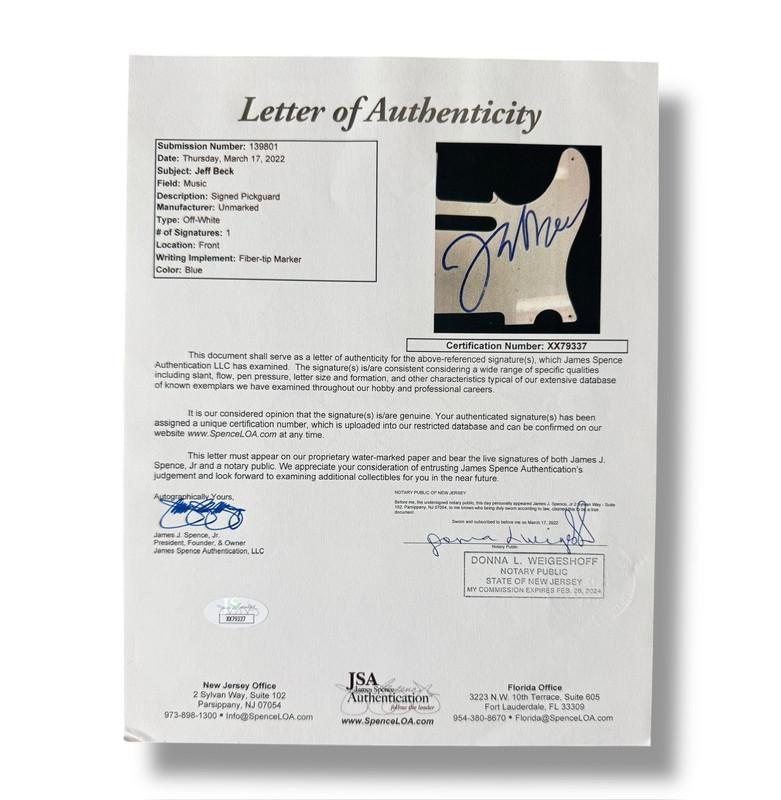Custom Autograph Edition Telecaster style electric guitar measures approximately 39" in length and has been hand-signed on the pickguard by Jeff Beck.